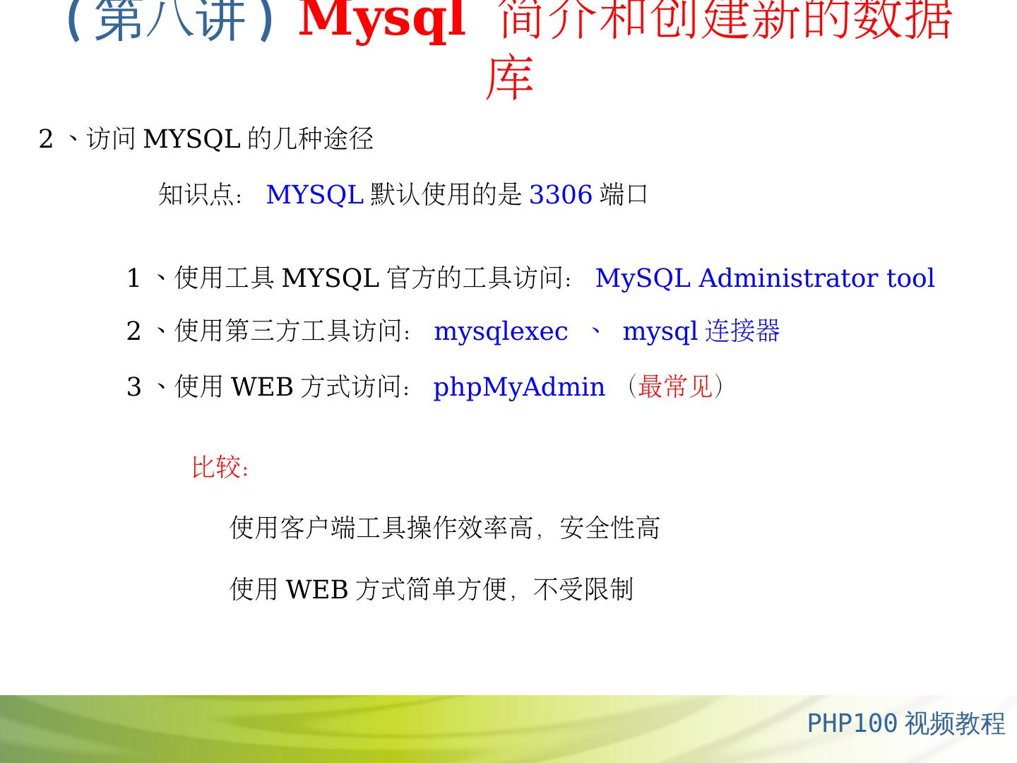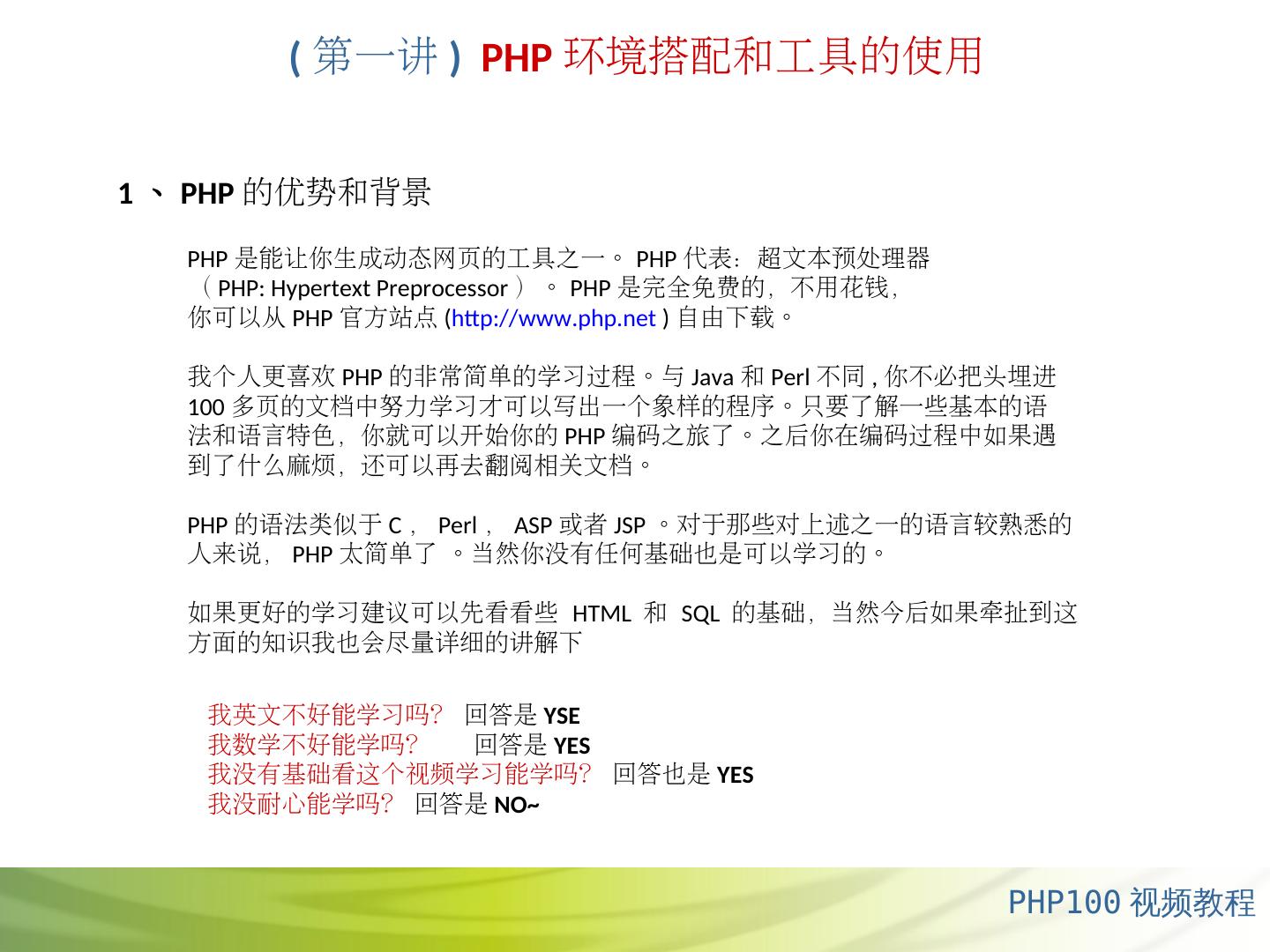 3 . ( 第一讲 ) PHP 环境搭配和工具的使用 1 、 PHP 的优势和背景 PHP 是能让你生成动态网页的工具之一。 PHP 代表:超文本预处理器 ( PHP: Hypertext Preprocessor )。 PHP 是完全免费的,不用花钱, 你可以从 PHP 官方站点 (http://www.php.net ) 自由下载。 我个人更喜欢 PHP 的非常简单的学习过程。与 Java 和 Perl 不同 , 你不必把头埋进 100 多页的文档中努力学习才可以写出一个象样的程序。只要了解一些基本的语 法和语言特色,你就可以开始你的 PHP 编码之旅了。之后你在编码过程中如果遇 到了什么麻烦,还可以再去翻阅相关文档。 PHP 的语法类似于 C , Perl , ASP 或者 JSP 。对于那些对上述之一的语言较熟悉的 人来说, PHP 太简单了 。当然你没有任何基础也是可以学习的。 如果更好的学习建议可以先看看些 HTML 和 SQL 的基础,当然今后如果牵扯到这 方面的知识我也会尽量详细的讲解下 我英文不好能学习吗? 回答是 YSE 我数学不好能学吗? 回答是 YES 我没有基础看这个视频学习能学吗? 回答也是 YES 我没耐心能学吗? 回答是 NO~ PHP100 视频教程