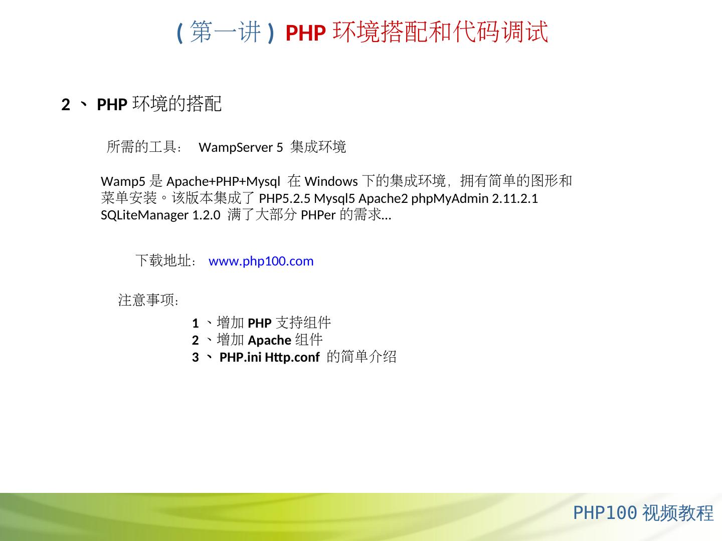4 . ( 第一讲 ) PHP 环境搭配和代码调试 2 、 PHP 环境的搭配 所需的工具: WampServer 5 集成环境 Wamp5 是 Apache+PHP+Mysql 在 Windows 下的集成环境,拥有简单的图形和 菜单安装。该版本集成了 PHP5.2.5 Mysql5 Apache2 phpMyAdmin 2.11.2.1 SQLiteManager 1.2.0 满了大部分 PHPer 的需求… 下载地址: www.php100.com 注意事项: 1 、增加 PHP 支持组件 2 、增加 Apache 组件 3 、 PHP.ini Http.conf 的简单介绍 PHP100 视频教程