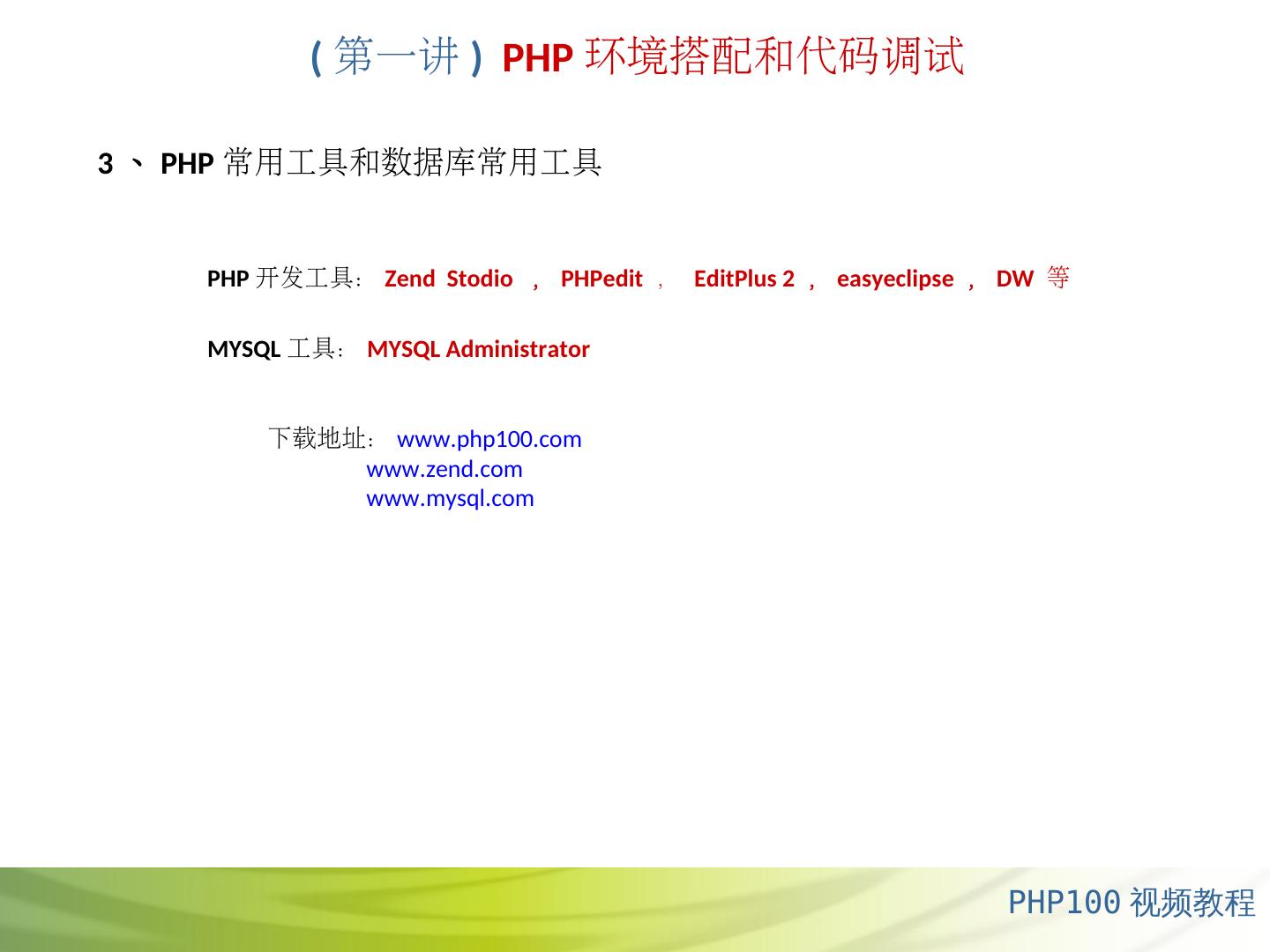 5 . ( 第一讲 ) PHP 环境搭配和代码调试 3 、 PHP 常用工具和数据库常用工具 PHP 开发工具: Zend Stodio , PHPedit , EditPlus 2 , easyeclipse , DW 等 MYSQL 工具: MYSQL Administrator 下载地址: www.php100.com www.zend.com www.mysql.com PHP100 视频教程