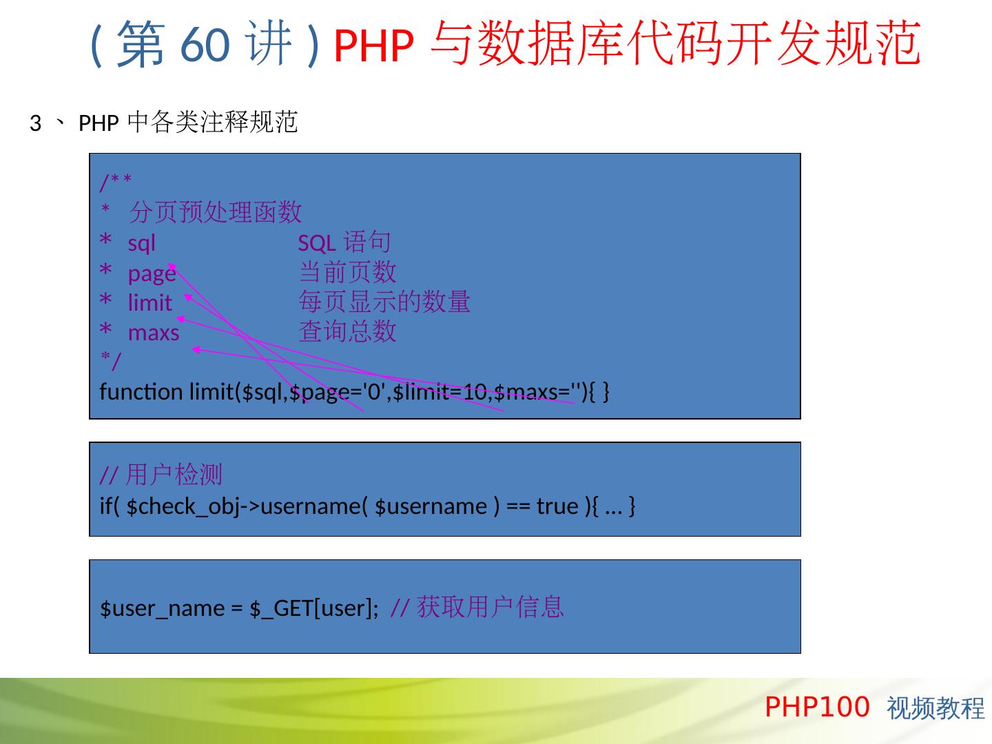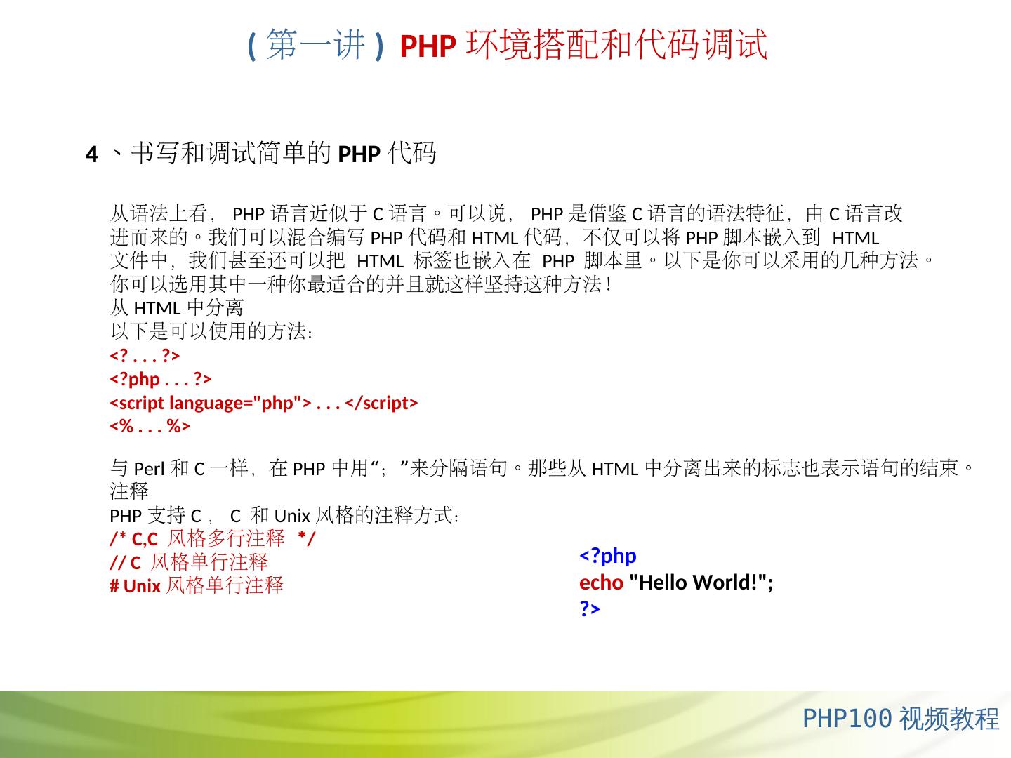6 . ( 第一讲 ) PHP 环境搭配和代码调试 4 、书写和调试简单的 PHP 代码 从语法上看, PHP 语言近似于 C 语言。可以说, PHP 是借鉴 C 语言的语法特征,由 C 语言改 进而来的。我们可以混合编写 PHP 代码和 HTML 代码,不仅可以将 PHP 脚本嵌入到 HTML 文件中,我们甚至还可以把 HTML 标签也嵌入在 PHP 脚本里。以下是你可以采用的几种方法。 你可以选用其中一种你最适合的并且就这样坚持这种方法! 从 HTML 中分离 以下是可以使用的方法: <? . . . ?> <?php . . . ?> <script language="php"> . . . </script> script> <% . . . %> 与 Perl 和 C 一样,在 PHP 中用“;”来分隔语句。那些从”来分隔语句。那些从 HTML 中分离出来的标志也表示语句的结束。 注释 PHP 支持 C , C 和 Unix 风格的注释方式: /script> * C,C 风格多行注释 */script> /script> /script> C 风格单行注释 <?php # Unix 风格单行注释 echo "Hello World!"; ?> PHP100 视频教程
