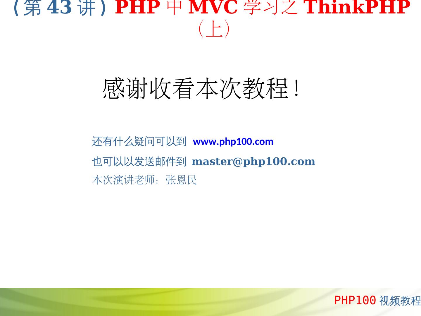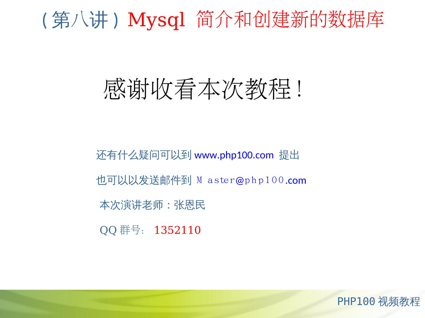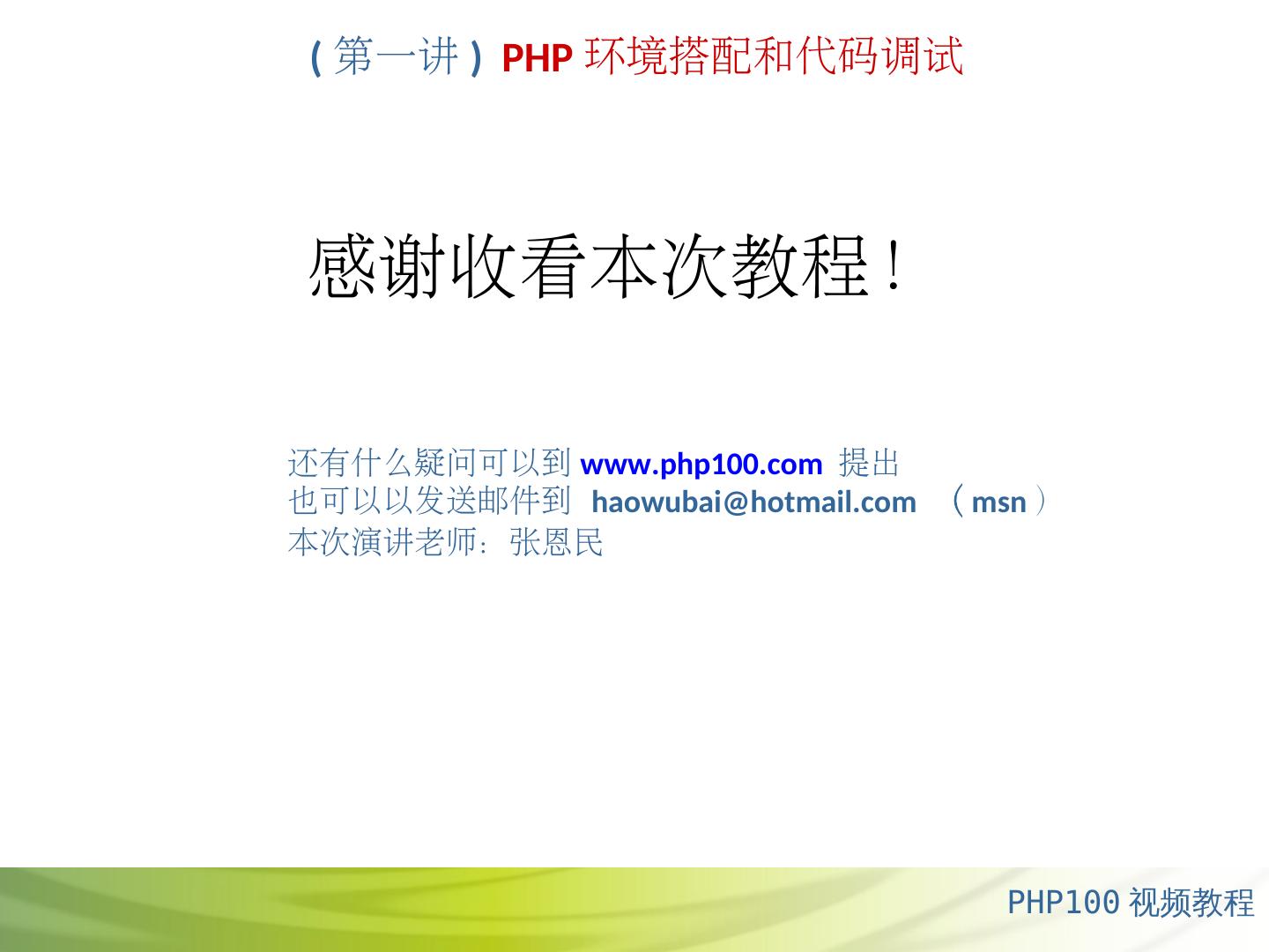 8 . ( 第一讲 ) PHP 环境搭配和代码调试 感谢收看本次教程! 还有什么疑问可以到 www.php100.com 提出 也可以以发送邮件到 haowubai@hotmail.com ( msn ) 本次演讲老师:张恩民 PHP100 视频教程
