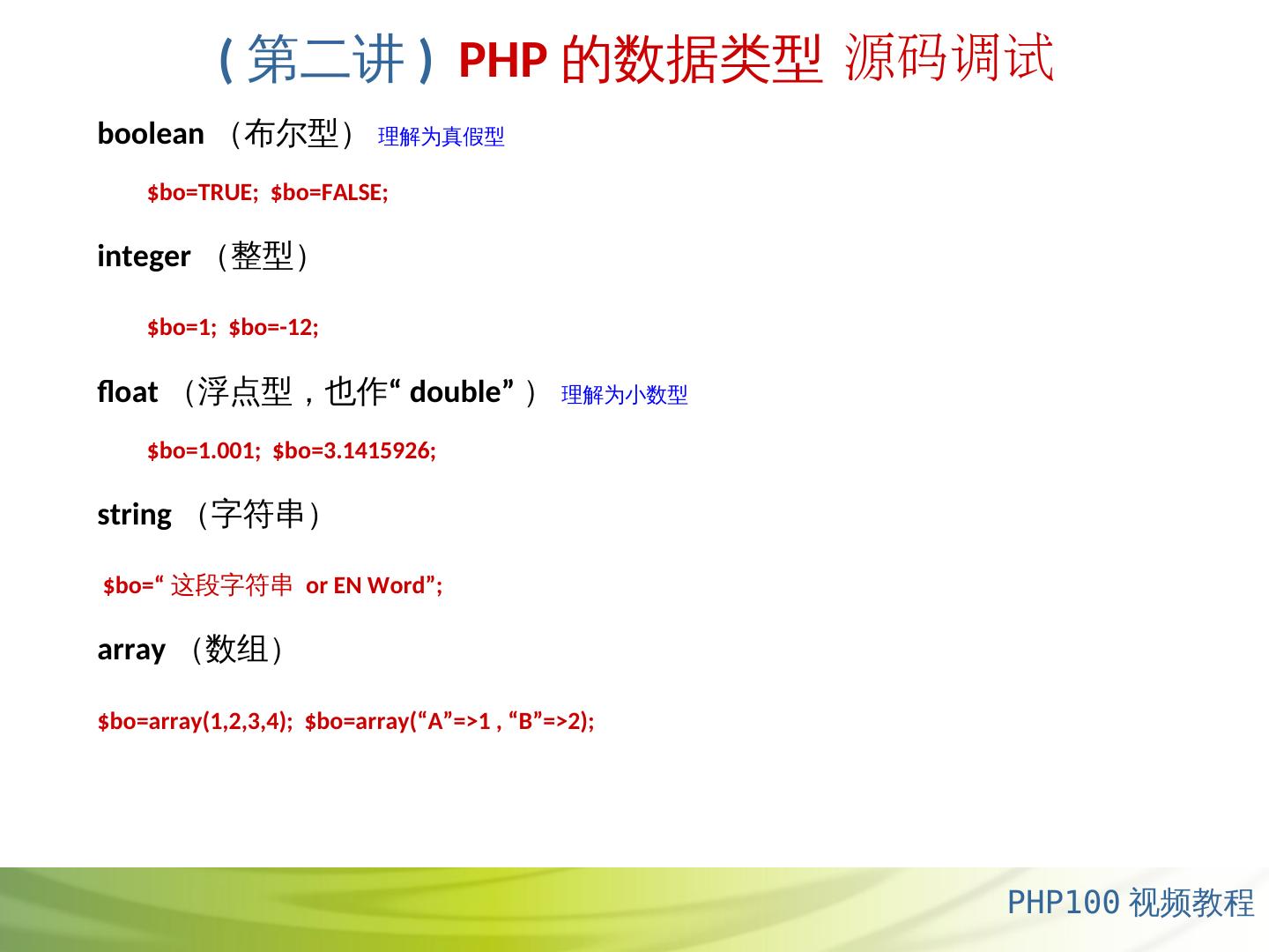 10 . ( 第二讲 ) PHP 的数据类型 源码调试 1 、 PHP 基本语法和数据类型: ( 1 )、 PHP 基本语法: 1 、 htm 和 php 混编 2 、一个语句以 ; ( 分号结束 ) 3 、如何定义一个变量,和变量的使用 ( 2 )、 PHP 数据运算类型 四种标量类型: boolean (布尔型) 理解为真假型 integer (整型) float (浮点型,也作““ double” ) 理解为小数型 string (字符串) 两种复合类型: array (数组) object (对象) PHP100 视频教程
