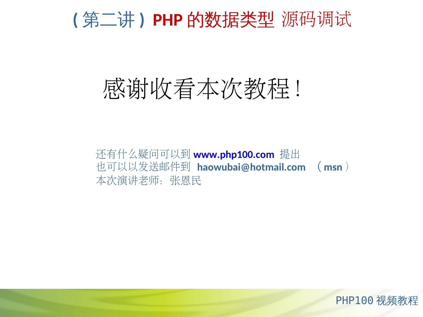 13 .( 第二讲 ) PHP 的数据类型 源码调试 感谢收看本次教程! 还有什么疑问可以到 www.php100.com 提出 也可以以发送邮件到 haowubai@hotmail.com ( msn ) 本次演讲老师:张恩民 PHP100 视频教程