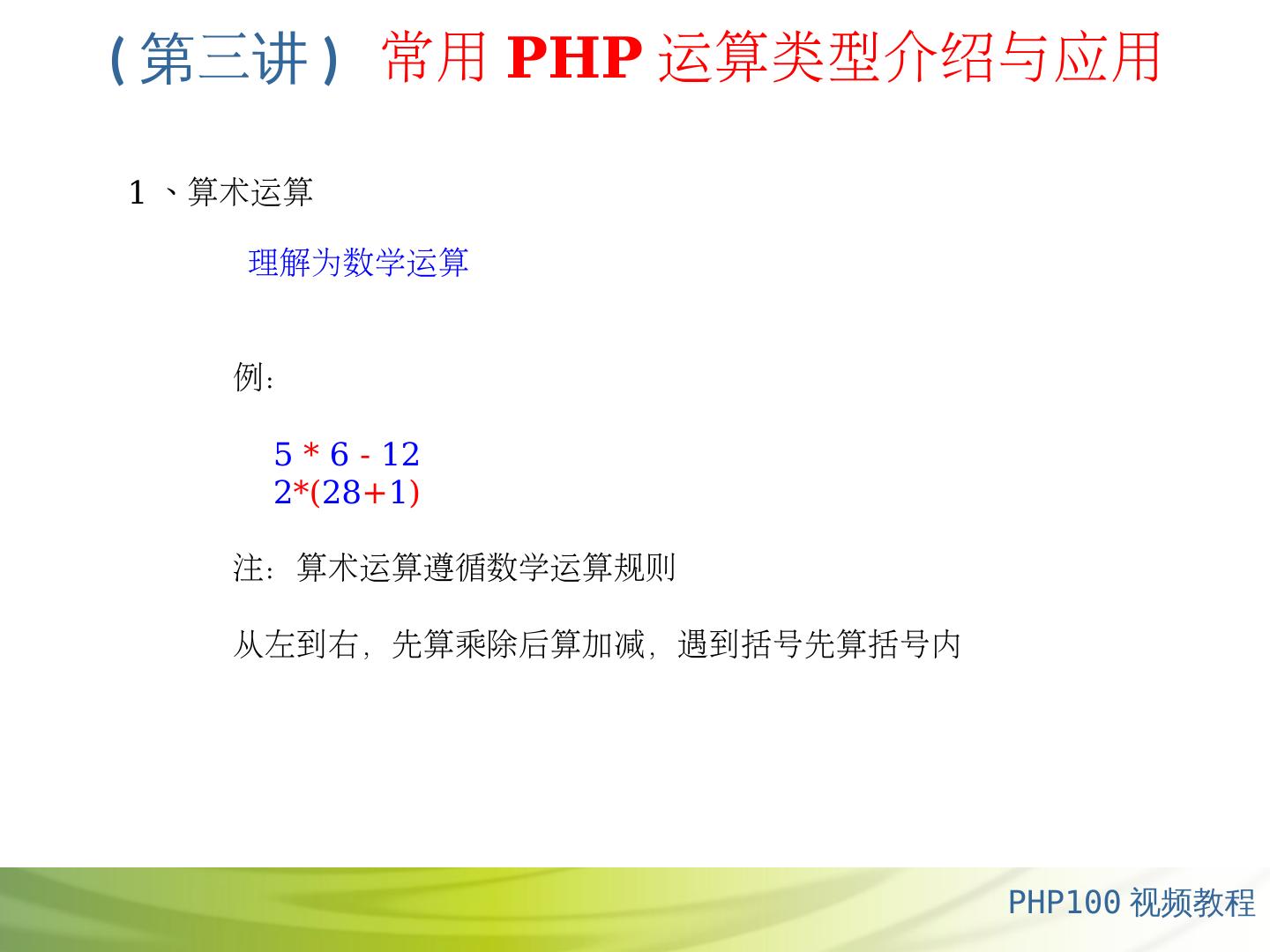 15 .( 第三讲 ) 常用 PHP 运算类型介绍与应用 1 、算术运算 理解为数学运算 例: 5 * 6 - 12 2*(28+1) 注:算术运算遵循数学运算规则 从左到右,先算乘除后算加减,遇到括号先算括号内 PHP100 视频教程