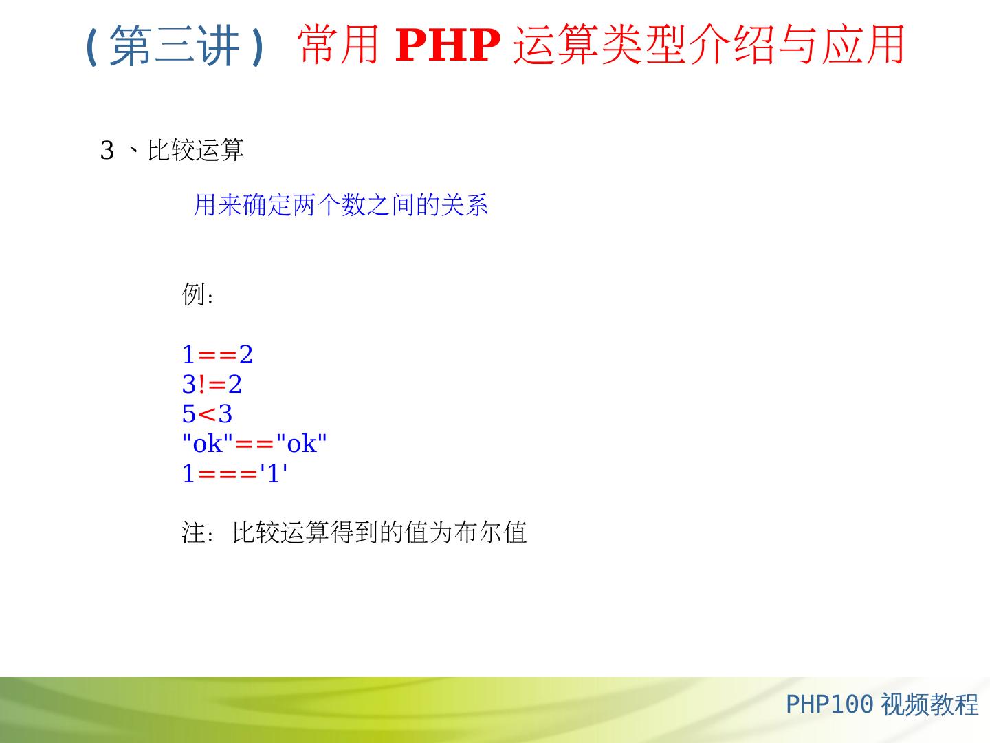 17 .( 第三讲 ) 常用 PHP 运算类型介绍与应用 3 、比较运算 用来确定两个数之间的关系 例: 1==2 3!=2 5<3 "ok"=="ok" 1==='1' 注:比较运算得到的值为布尔值 PHP100 视频教程