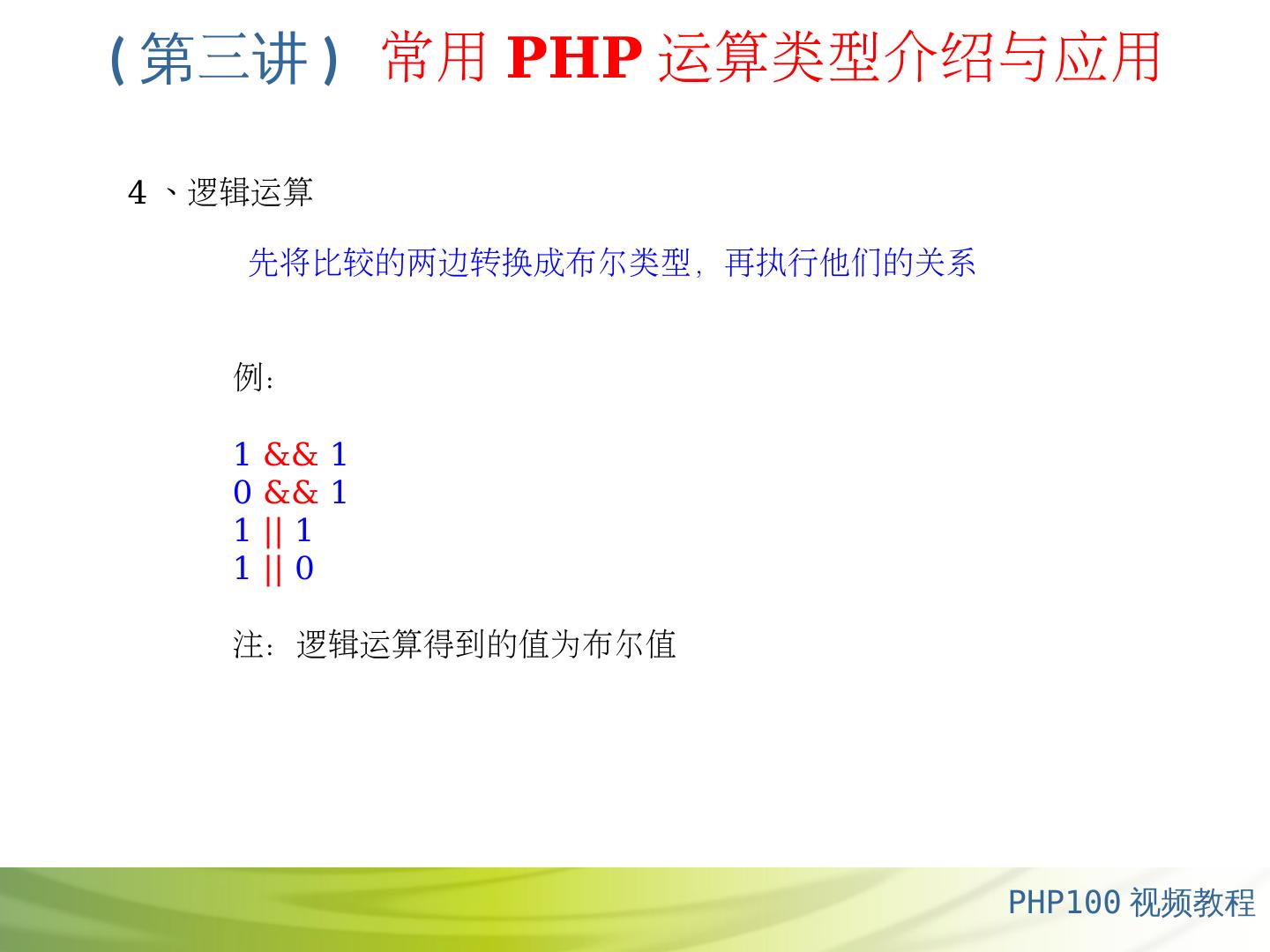 18 .( 第三讲 ) 常用 PHP 运算类型介绍与应用 4 、逻辑运算 先将比较的两边转换成布尔类型,再执行他们的关系 例: 1 && 1 0 && 1 1 || 1 1 || 0 注:逻辑运算得到的值为布尔值 PHP100 视频教程