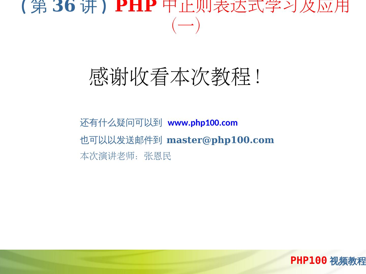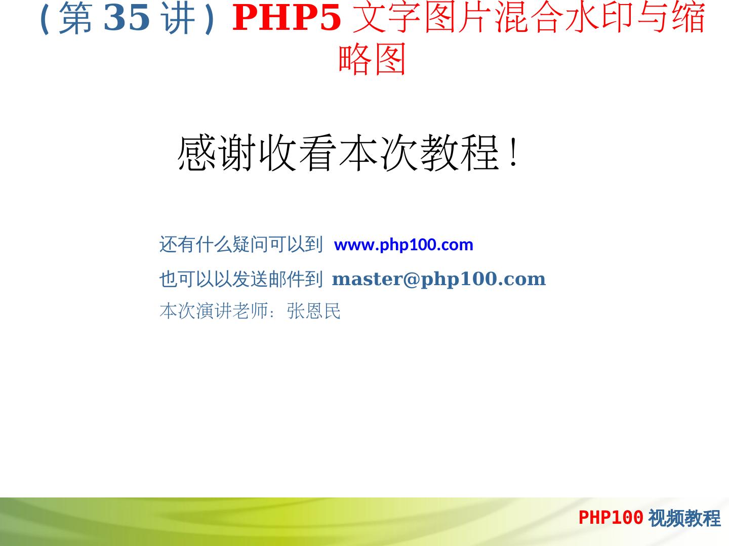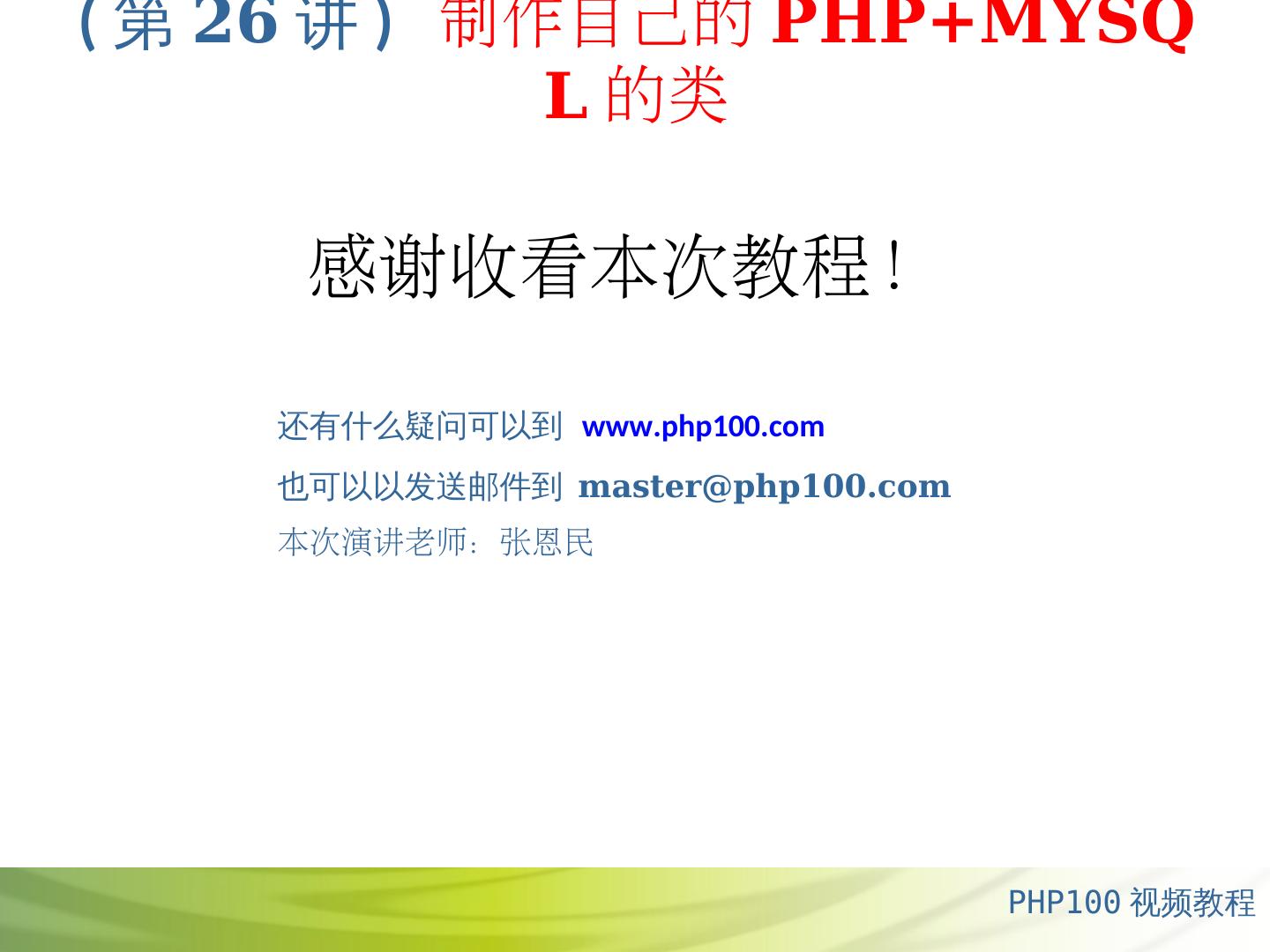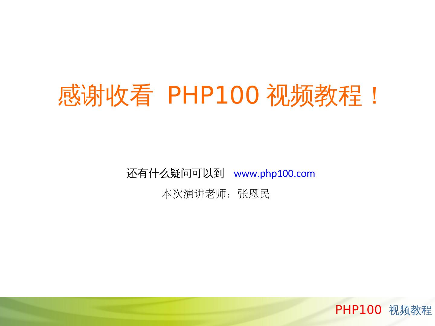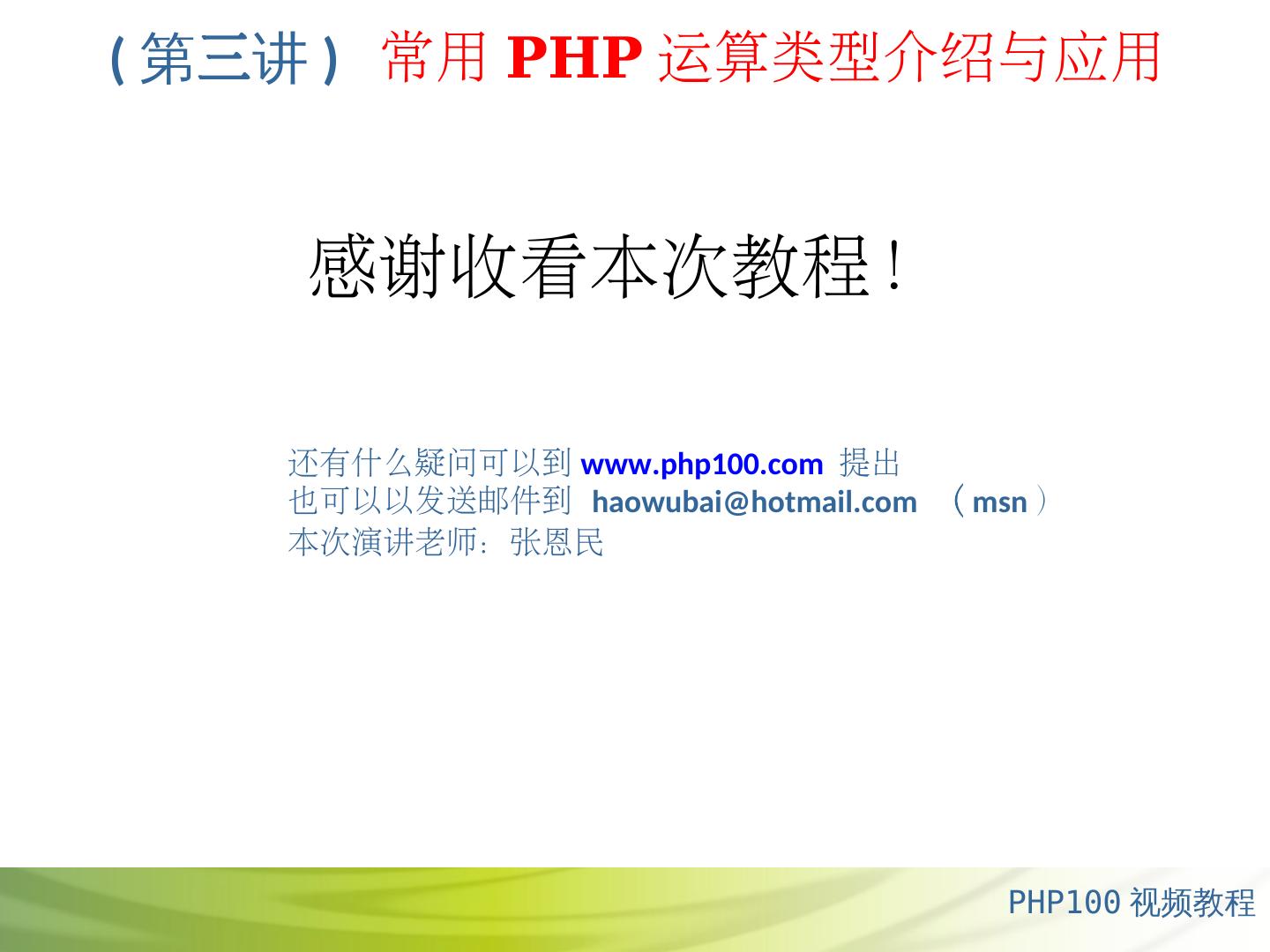 20 .( 第三讲 ) 常用 PHP 运算类型介绍与应用 感谢收看本次教程! 还有什么疑问可以到 www.php100.com 提出 也可以以发送邮件到 haowubai@hotmail.com ( msn ) 本次演讲老师:张恩民 PHP100 视频教程
