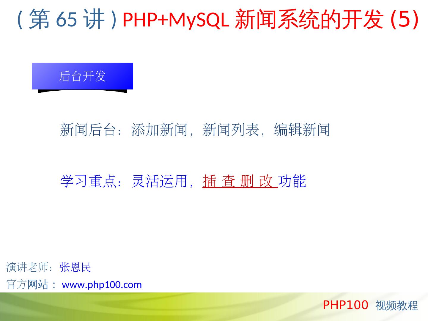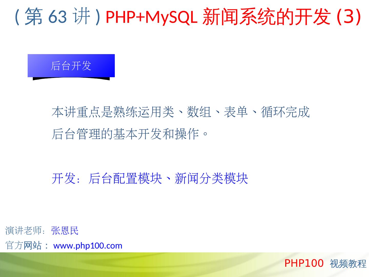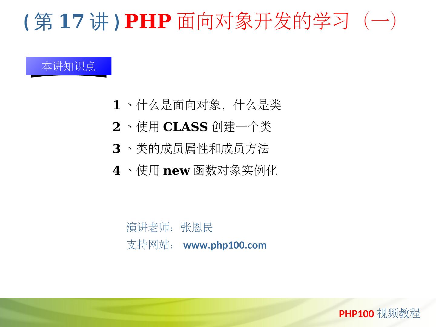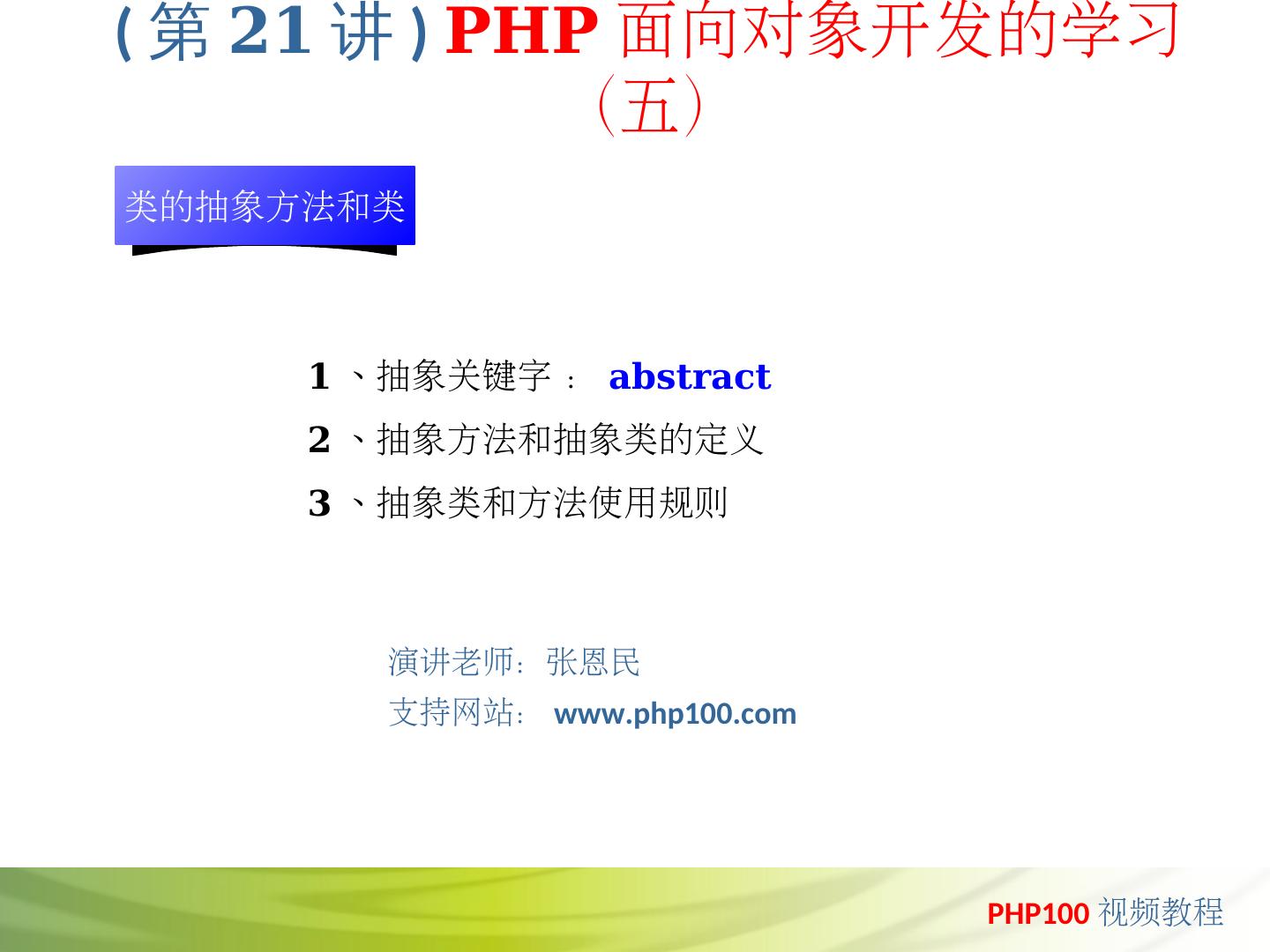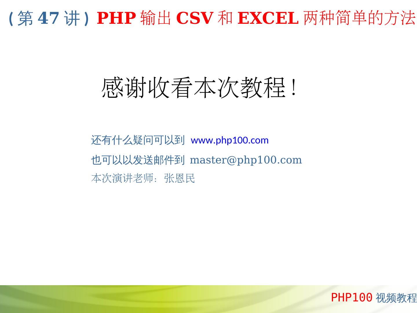20 .( 第三讲 ) 常用 PHP 运算类型介绍与应用 感谢收看本次教程! 还有什么疑问可以到 www.php100.com 提出 也可以以发送邮件到 haowubai@hotmail.com ( msn ) 本次演讲老师:张恩民 PHP100 视频教程
