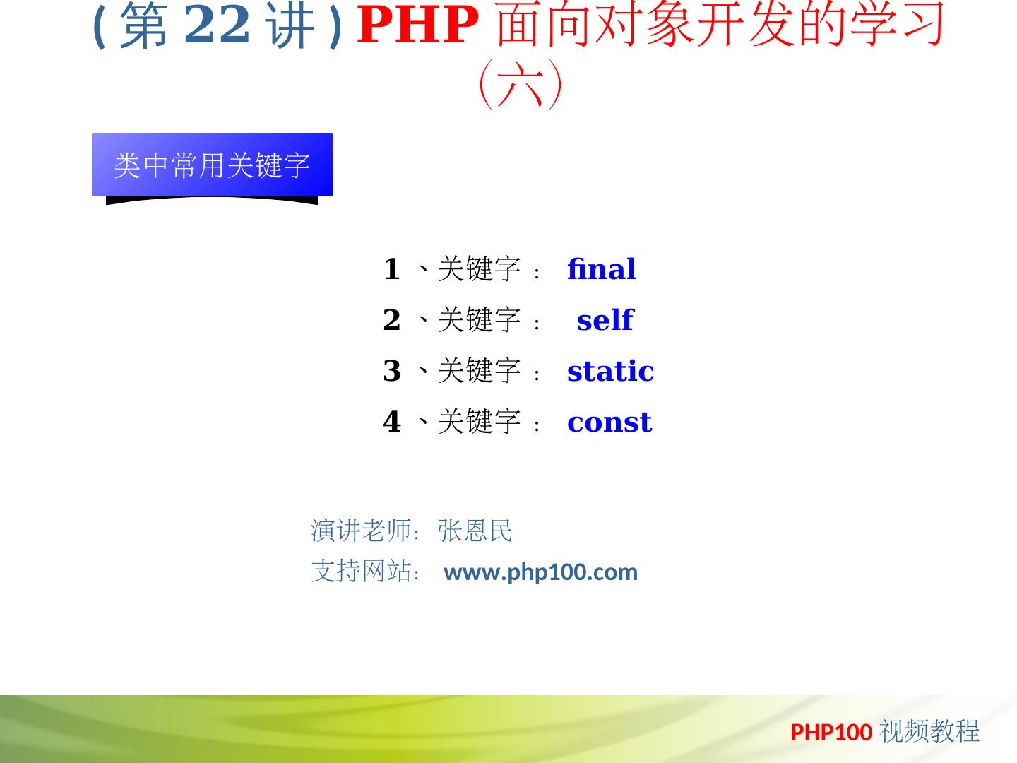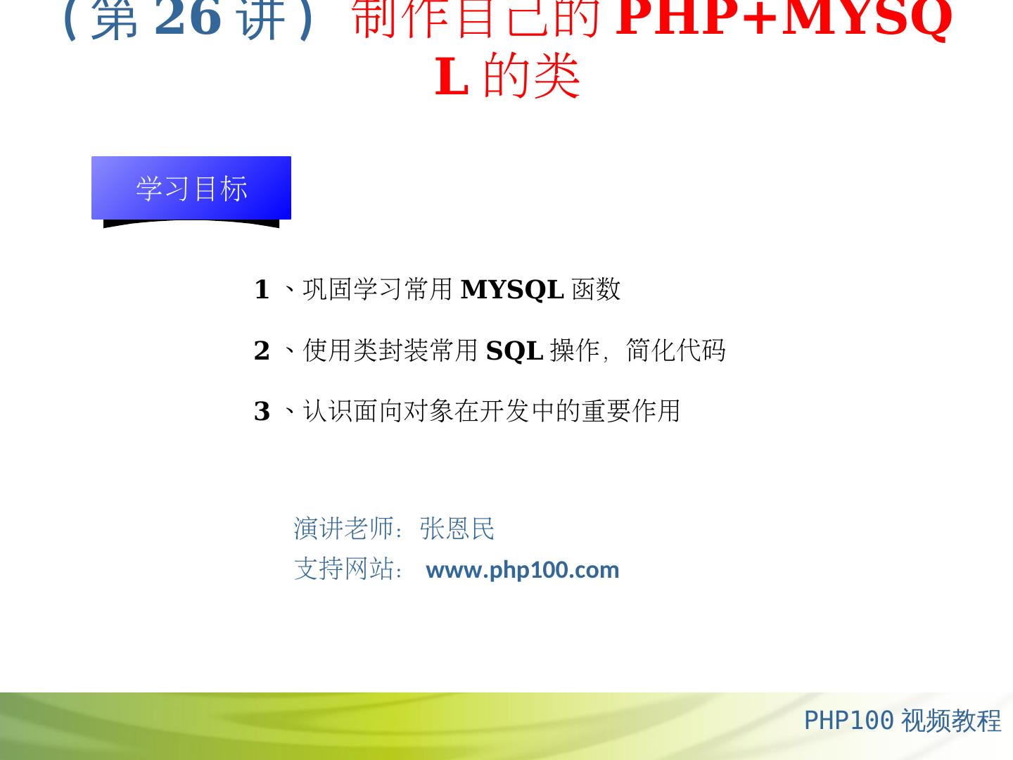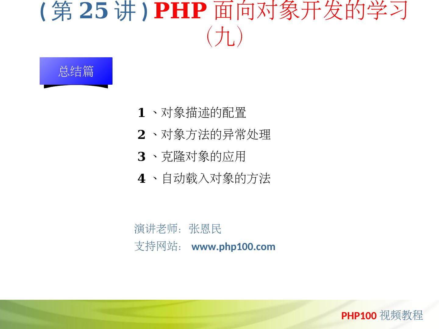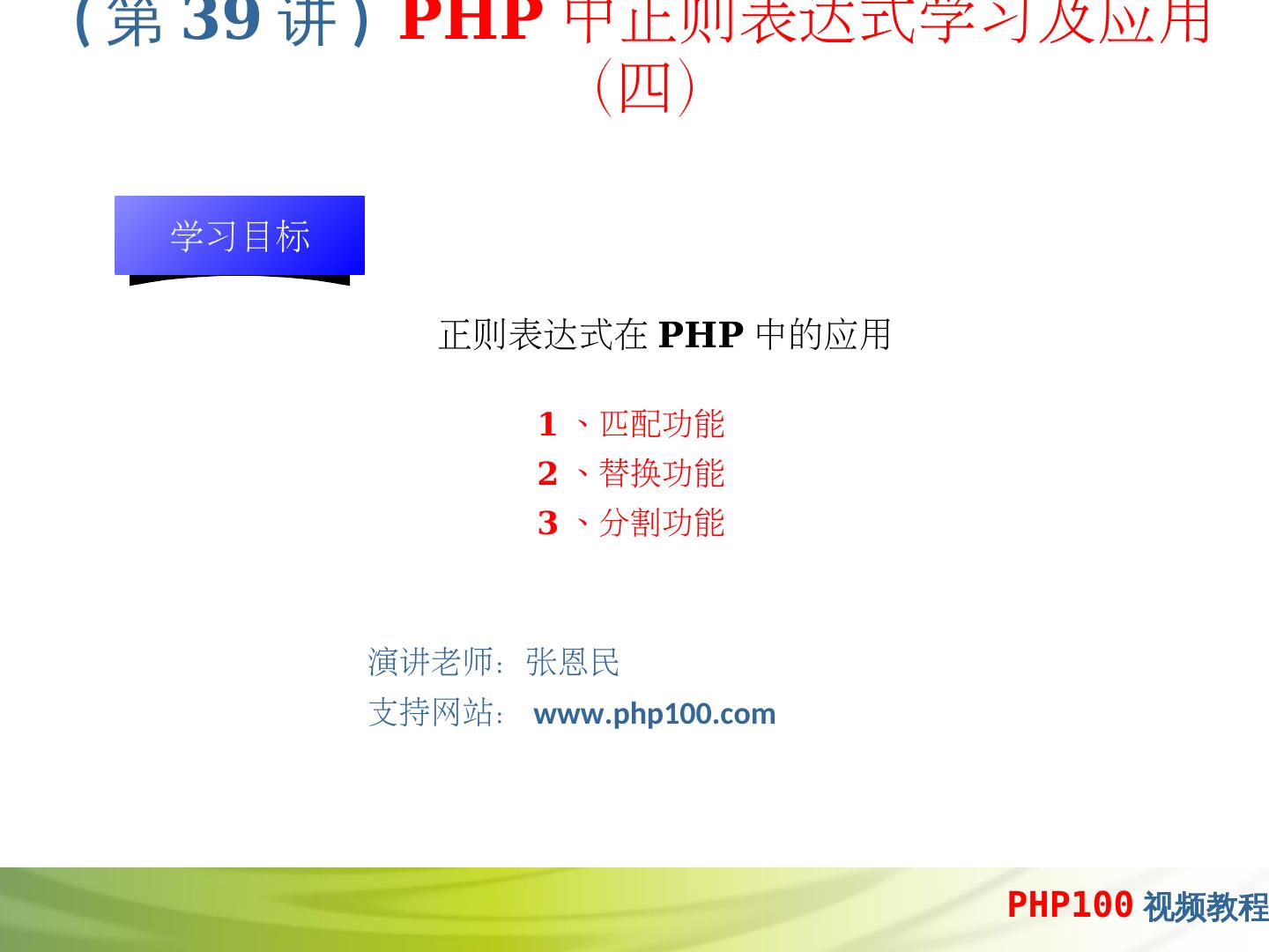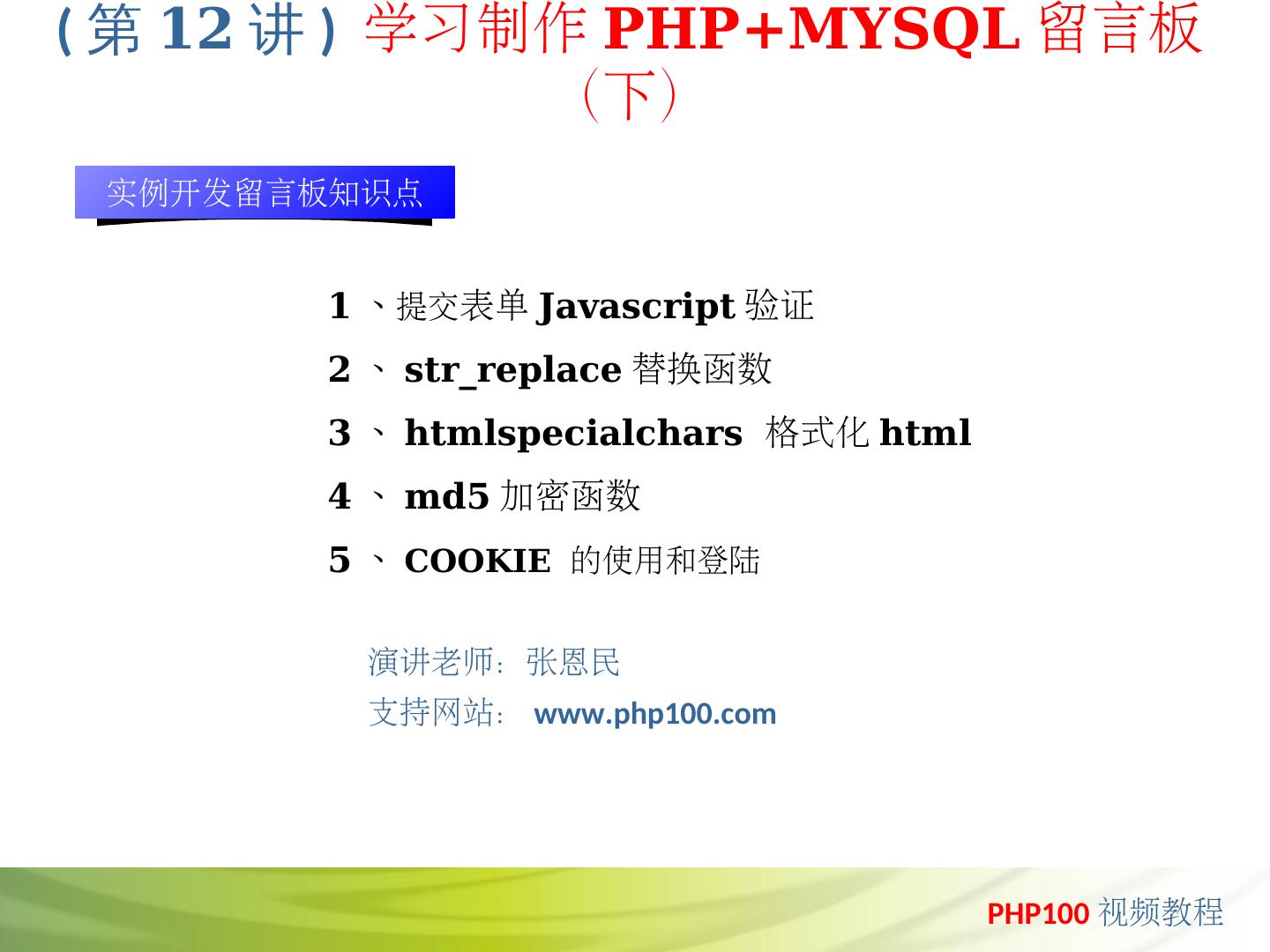 20 .( 第三讲 ) 常用 PHP 运算类型介绍与应用 感谢收看本次教程! 还有什么疑问可以到 www.php100.com 提出 也可以以发送邮件到 haowubai@hotmail.com ( msn ) 本次演讲老师:张恩民 PHP100 视频教程