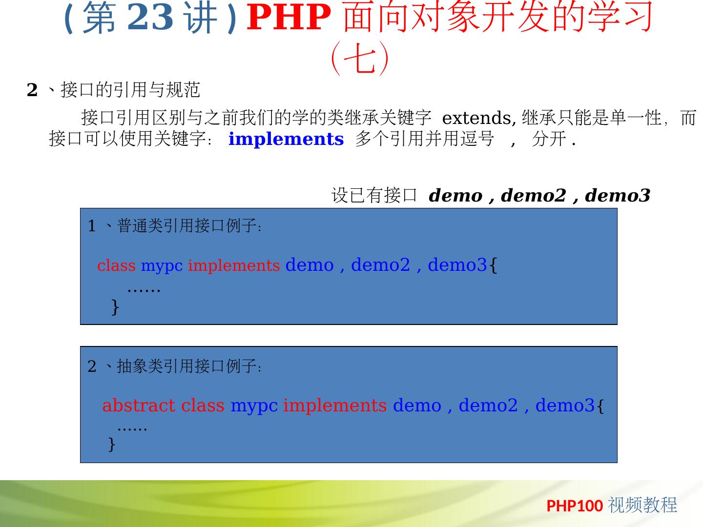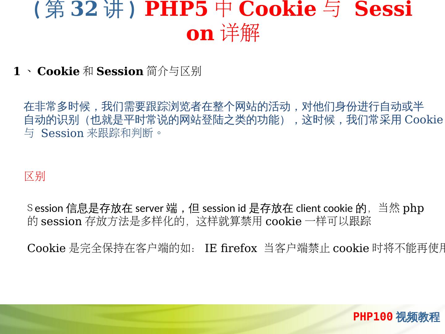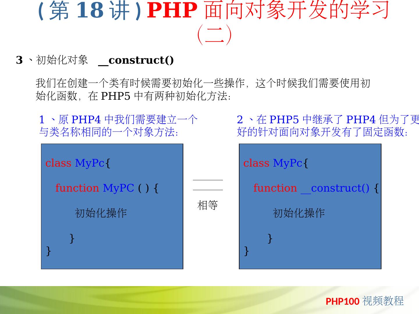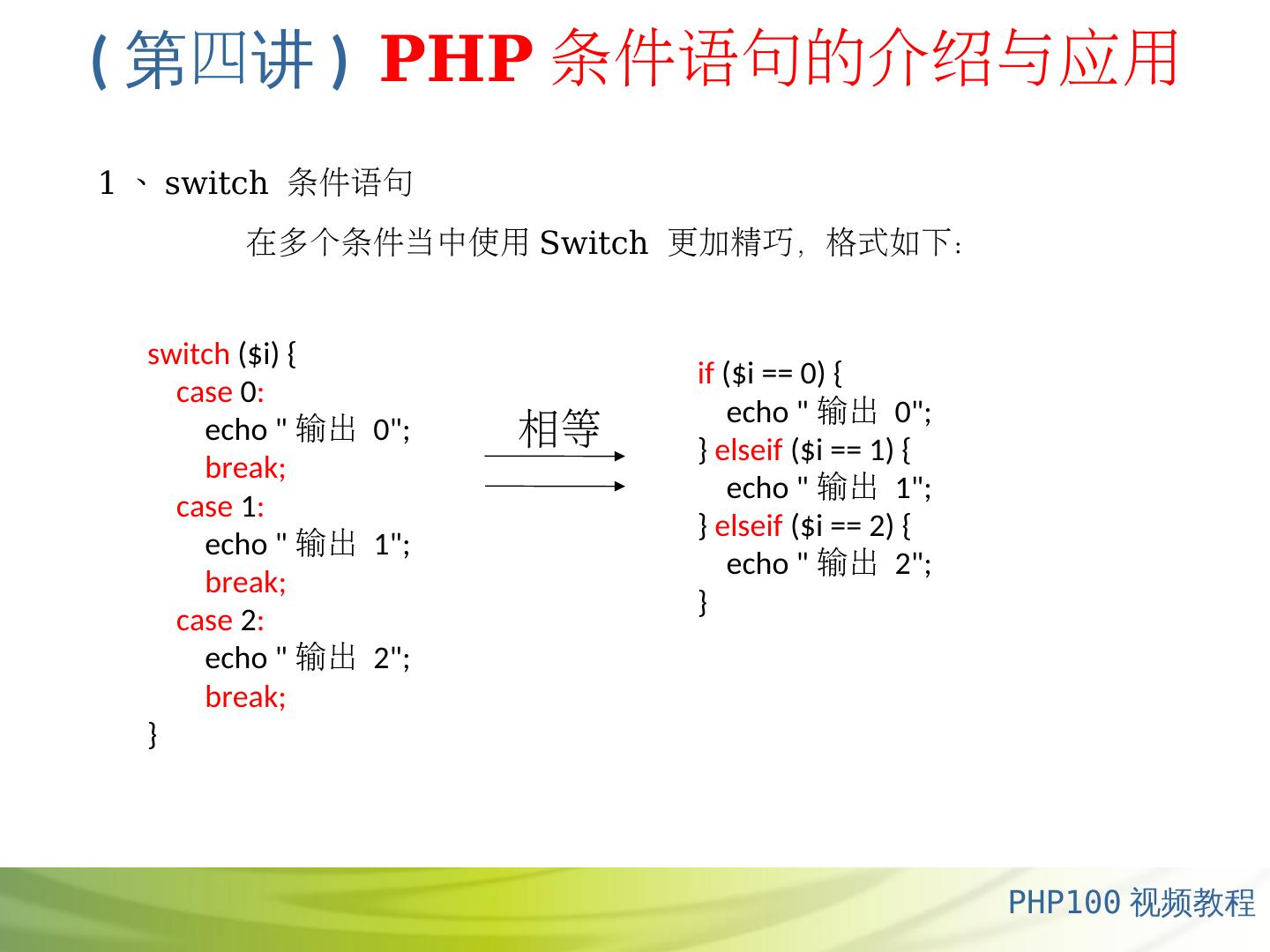23 .( 第四讲 ) PHP 条件语句的介绍与应用 1 、 switch 条件语句 在多个条件当中使用 Switch 更加精巧,格式如下: switch ($i) { if ($i == 0) { case 0: echo " 输出 0"; echo " 输出 0"; 相等 } elseif ($i == 1) { break; echo " 输出 1"; case 1: } elseif ($i == 2) { echo " 输出 1"; echo " 输出 2"; break; } case 2: echo " 输出 2"; break; } PHP100 视频教程