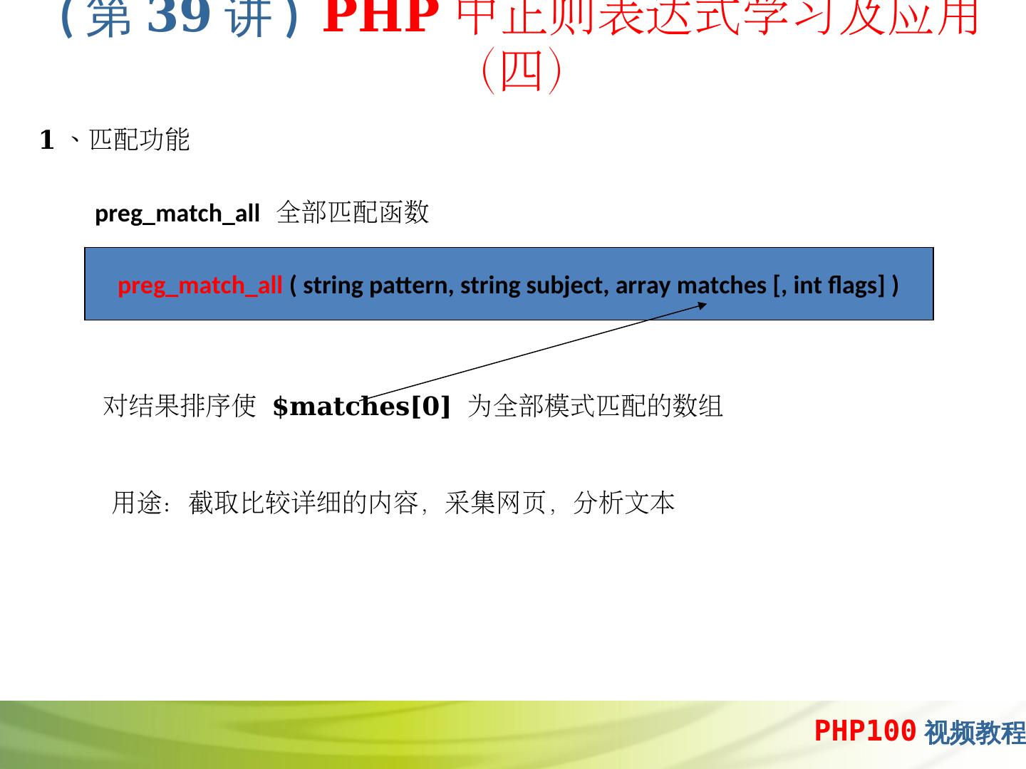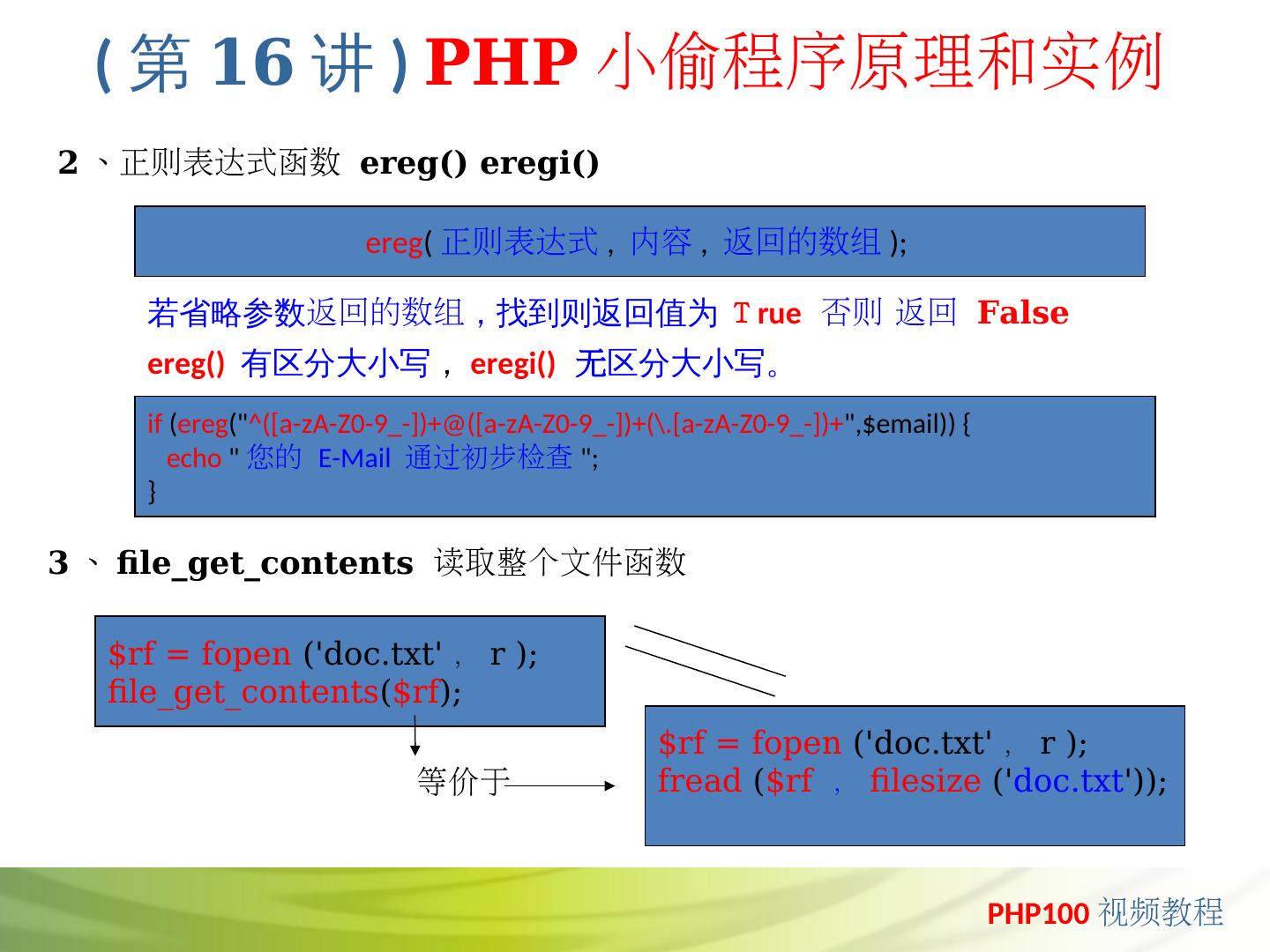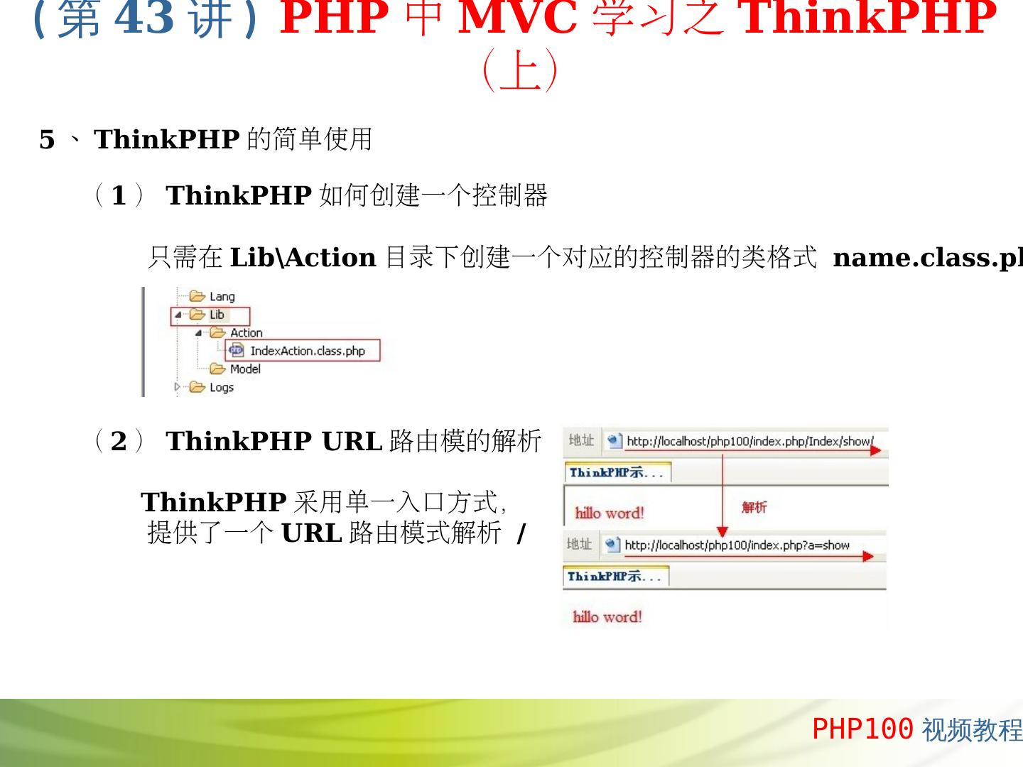23 .( 第四讲 ) PHP 条件语句的介绍与应用 1 、 switch 条件语句 在多个条件当中使用 Switch 更加精巧,格式如下: switch ($i) { if ($i == 0) { case 0: echo " 输出 0"; echo " 输出 0"; 相等 } elseif ($i == 1) { break; echo " 输出 1"; case 1: } elseif ($i == 2) { echo " 输出 1"; echo " 输出 2"; break; } case 2: echo " 输出 2"; break; } PHP100 视频教程