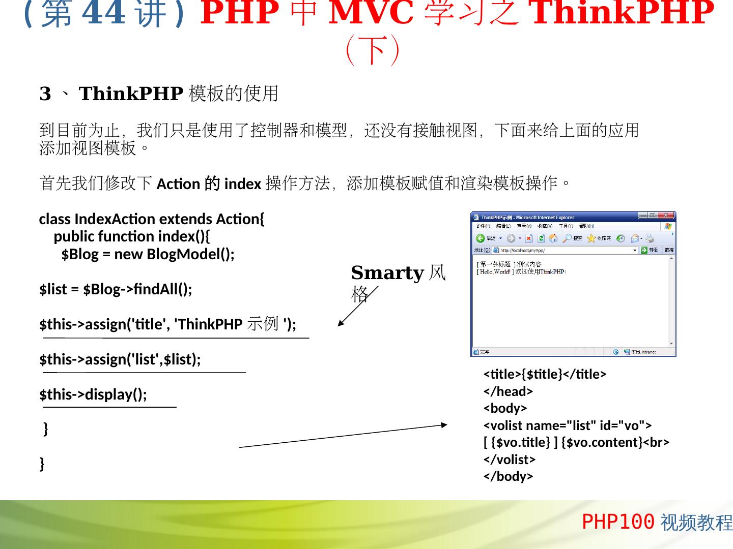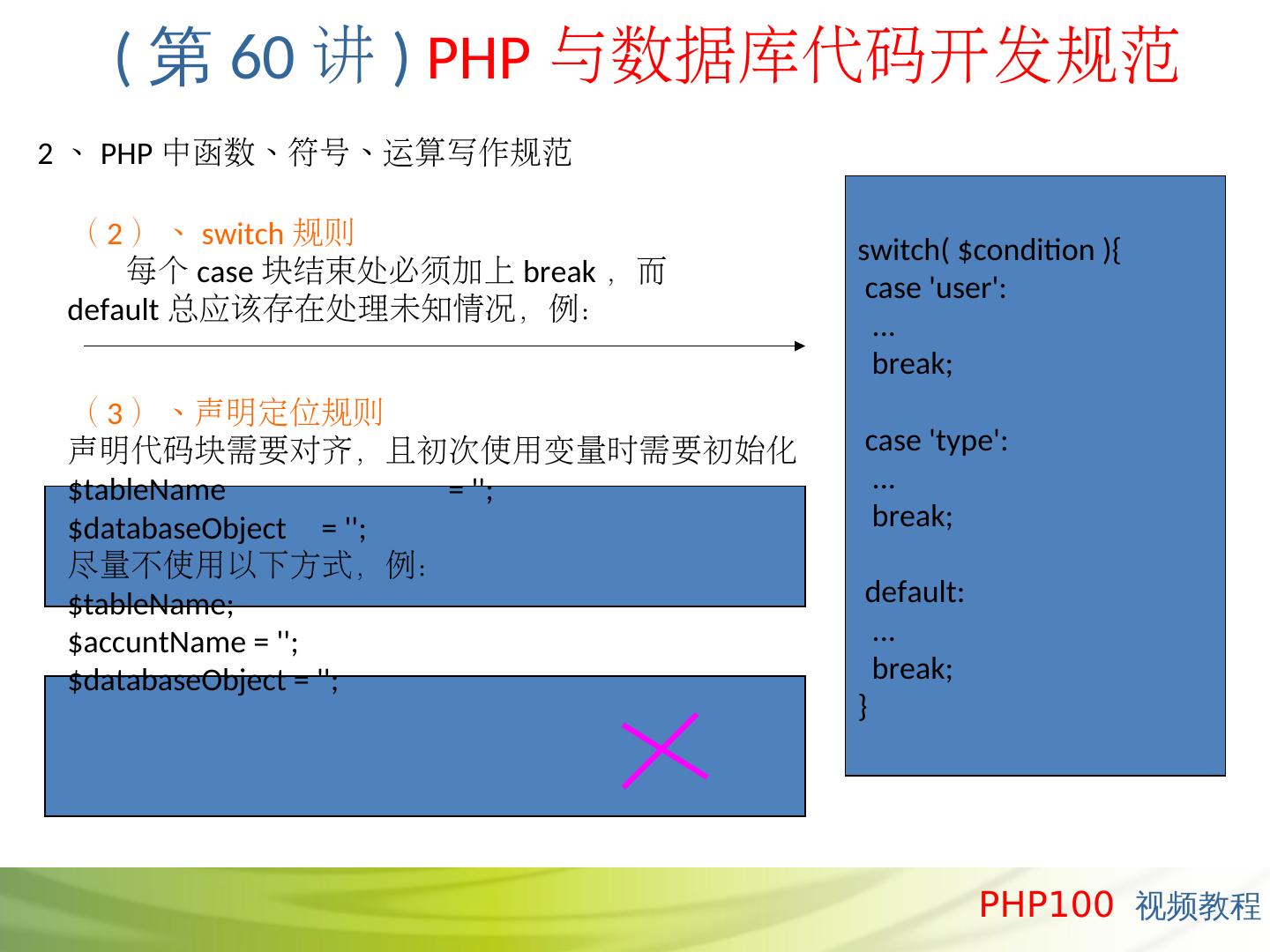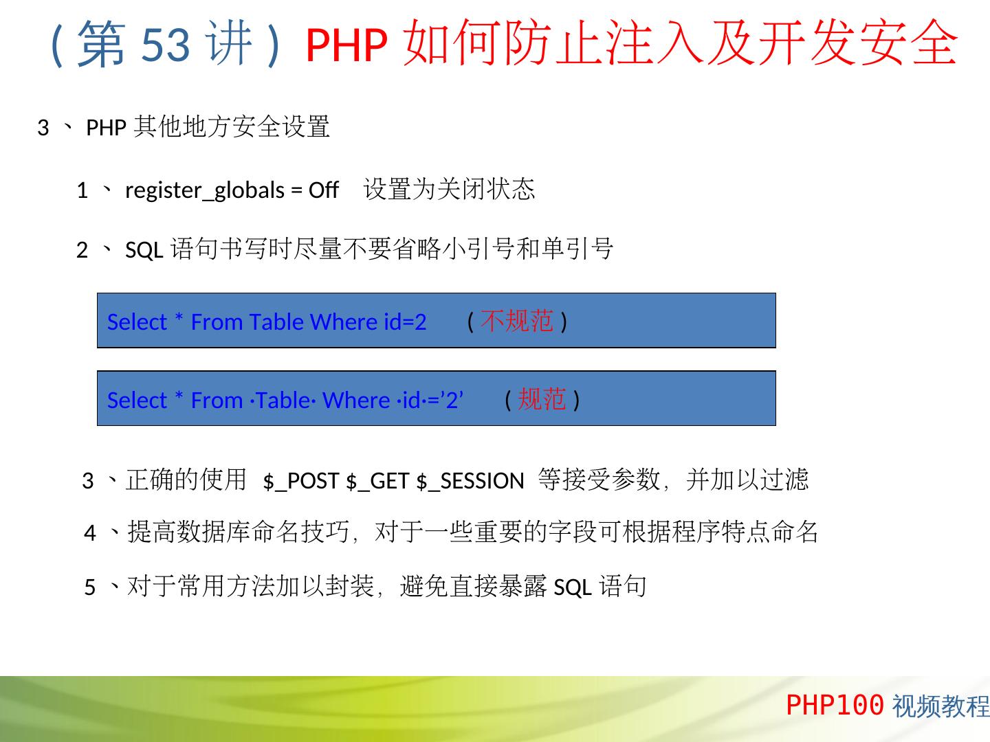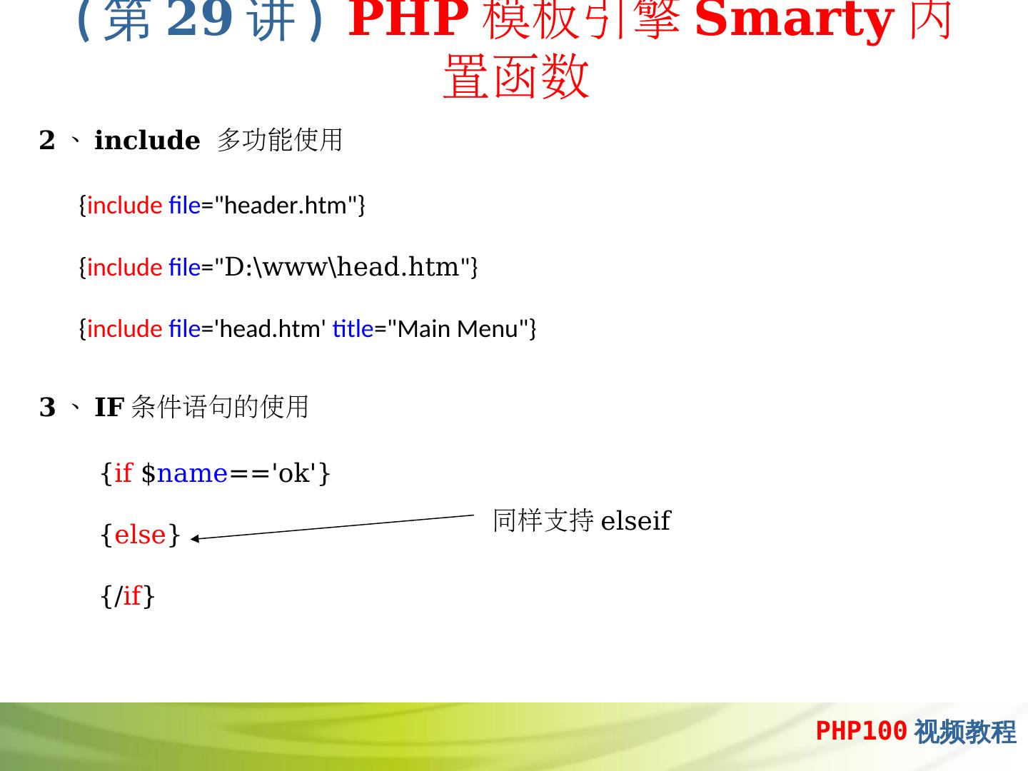 23 .( 第四讲 ) PHP 条件语句的介绍与应用 1 、 switch 条件语句 在多个条件当中使用 Switch 更加精巧,格式如下: switch ($i) { if ($i == 0) { case 0: echo " 输出 0"; echo " 输出 0"; 相等 } elseif ($i == 1) { break; echo " 输出 1"; case 1: } elseif ($i == 2) { echo " 输出 1"; echo " 输出 2"; break; } case 2: echo " 输出 2"; break; } PHP100 视频教程