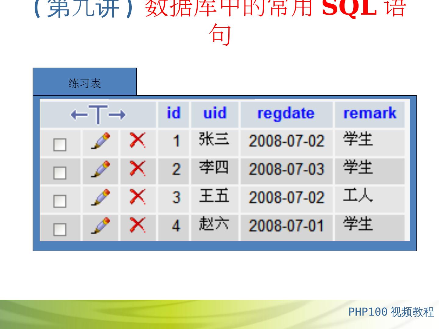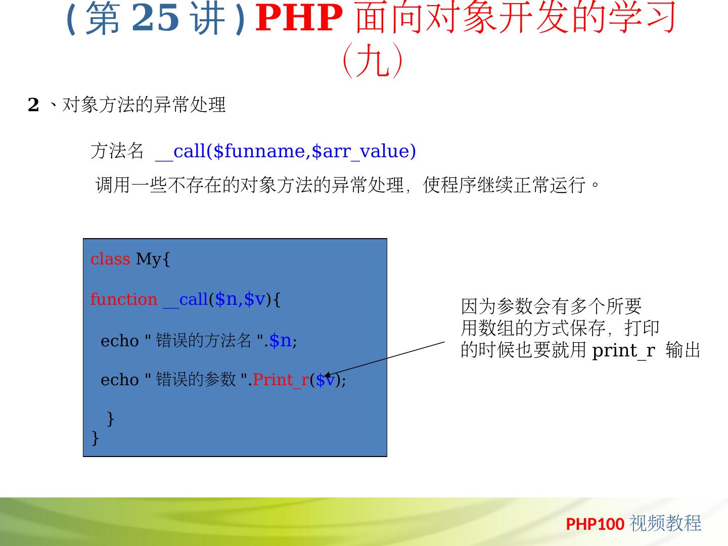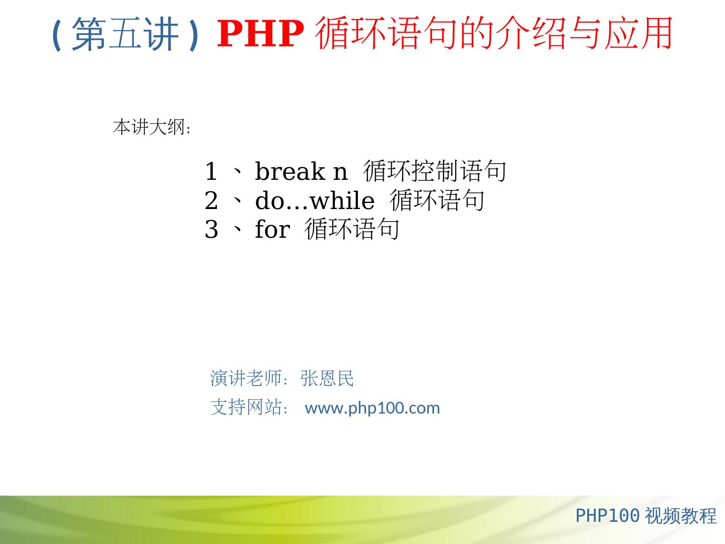 25 .( 第五讲 ) PHP 循环语句的介绍与应用 本讲大纲: 1 、 break n 循环控制语句 2 、 do…while 循环语句 3 、 for 循环语句 演讲老师:张恩民 支持网站: www.php100.com PHP100 视频教程