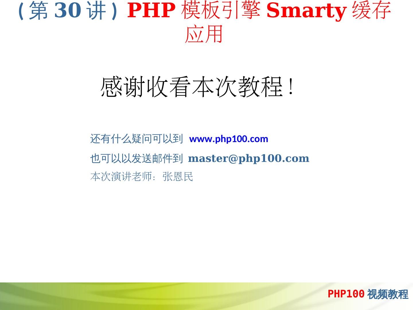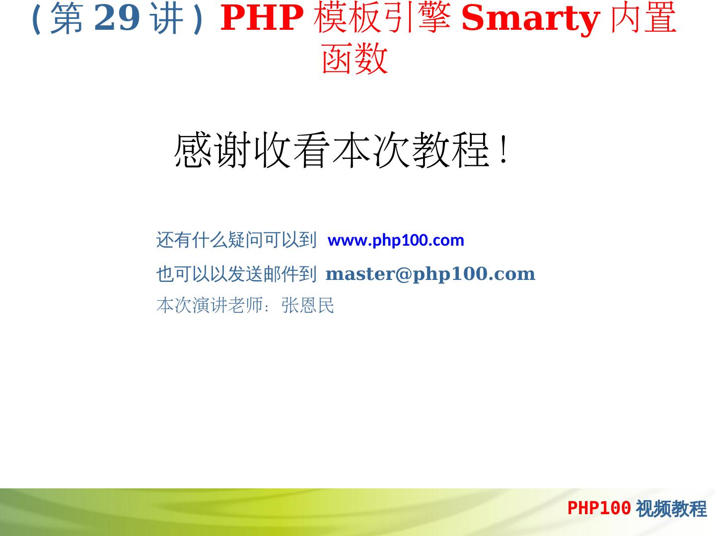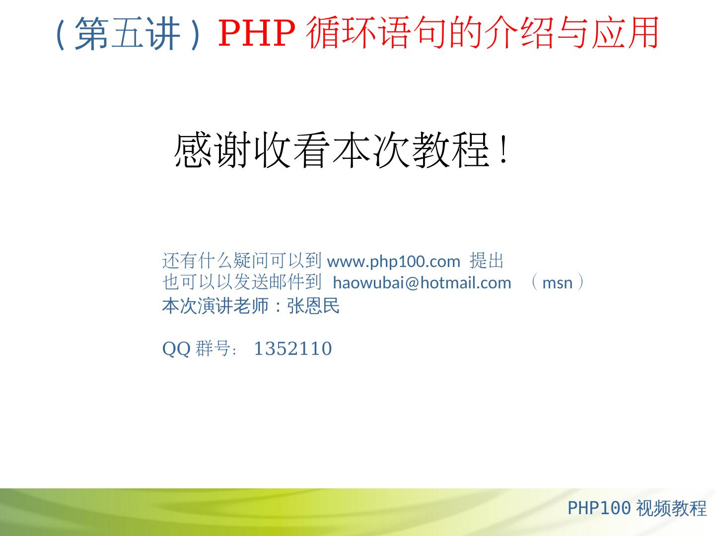 29 .( 第五讲 ) PHP 循环语句的介绍与应用 感谢收看本次教程! 还有什么疑问可以到 www.php100.com 提出 也可以以发送邮件到 haowubai@hotmail.com ( msn ) 本次演讲老师: 张恩民 QQ 群号: 1352110 PHP100 视频教程