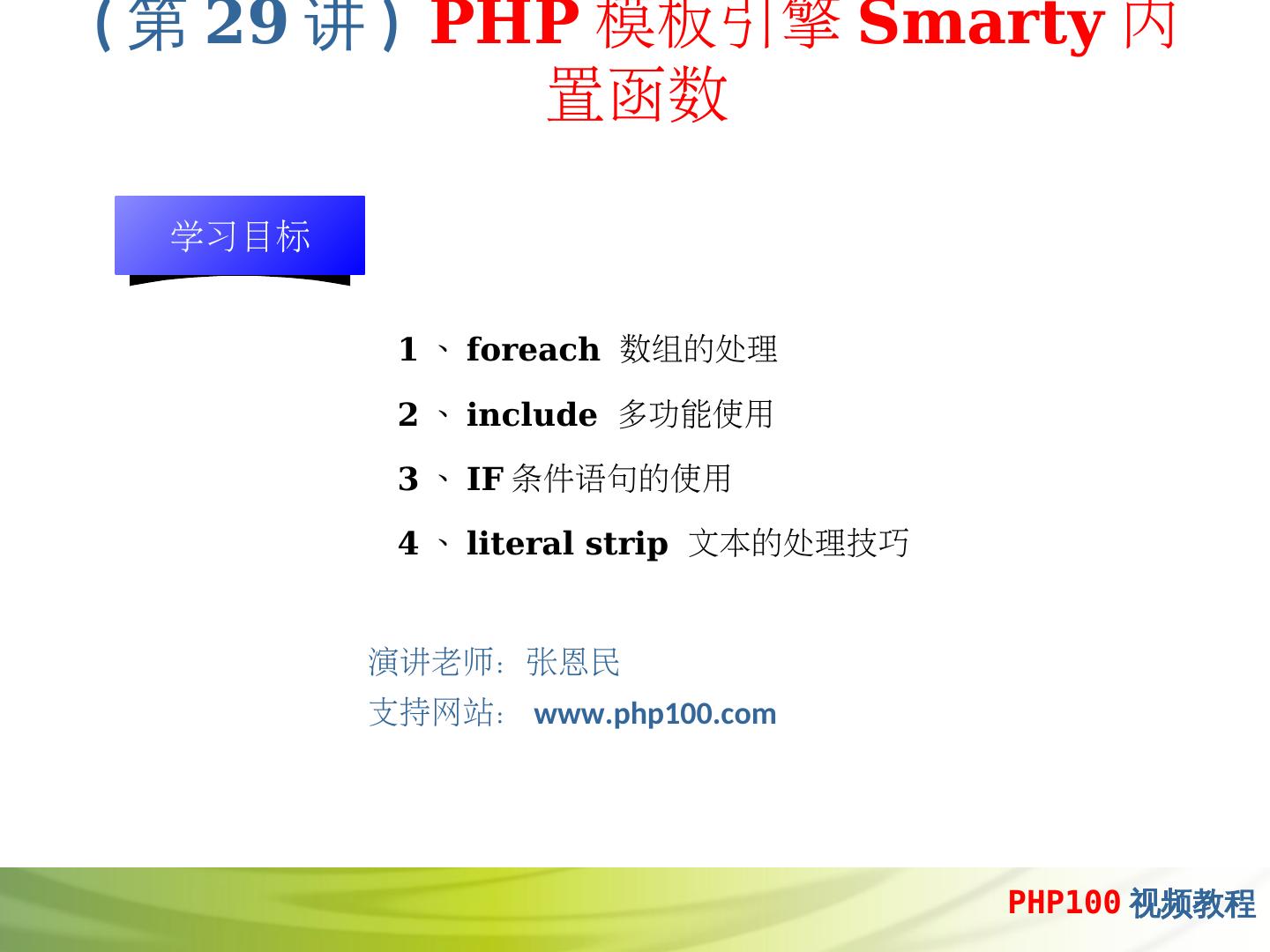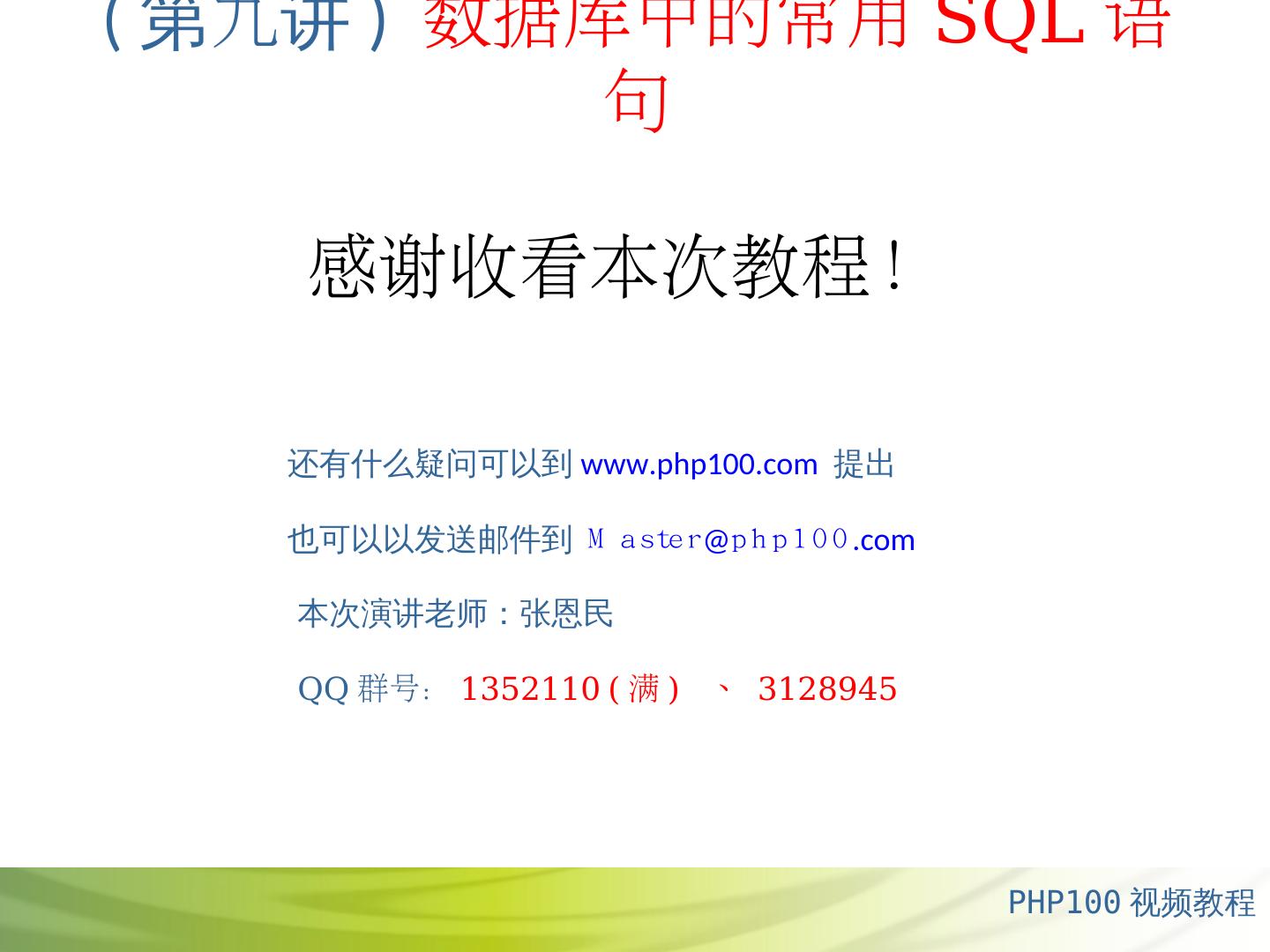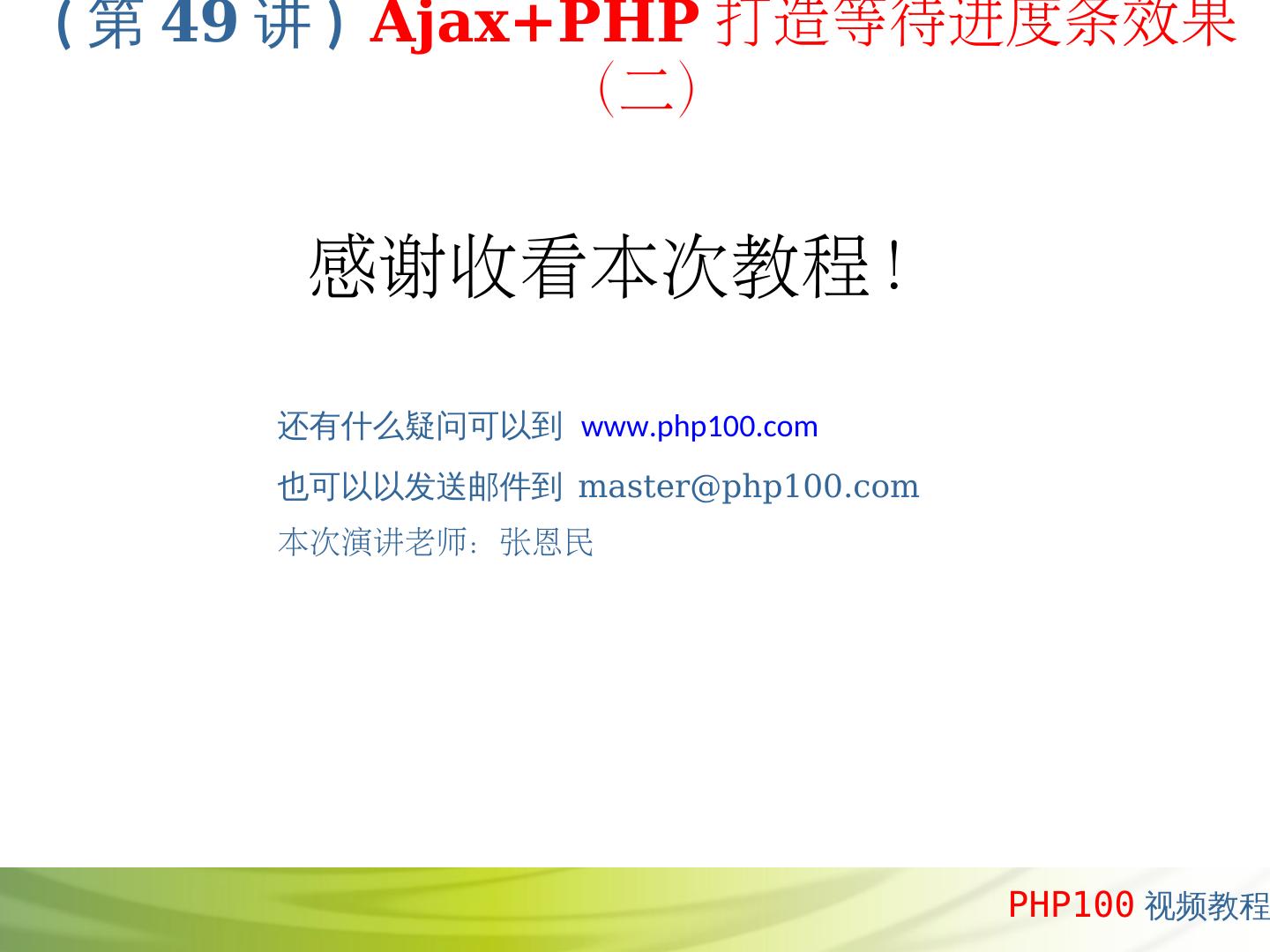 29 .( 第五讲 ) PHP 循环语句的介绍与应用 感谢收看本次教程! 还有什么疑问可以到 www.php100.com 提出 也可以以发送邮件到 haowubai@hotmail.com ( msn ) 本次演讲老师: 张恩民 QQ 群号: 1352110 PHP100 视频教程