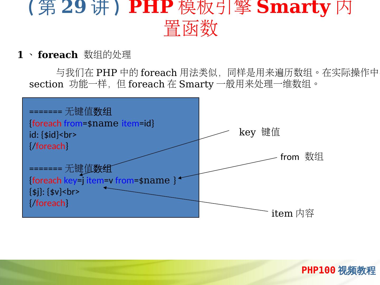 28 .( 第五讲 ) PHP 循环语句的介绍与应用 3 、 for 循环语句 for 循环是 PHP 中最复杂的循环结构。它的行为和 C 语言的相似。 for (expr1; expr2; expr3){ ……} for ($i = 1; $i <= 10; $i++) { echo $i; } 比较运算 循环条件 无条件执行 PHP100 视频教程