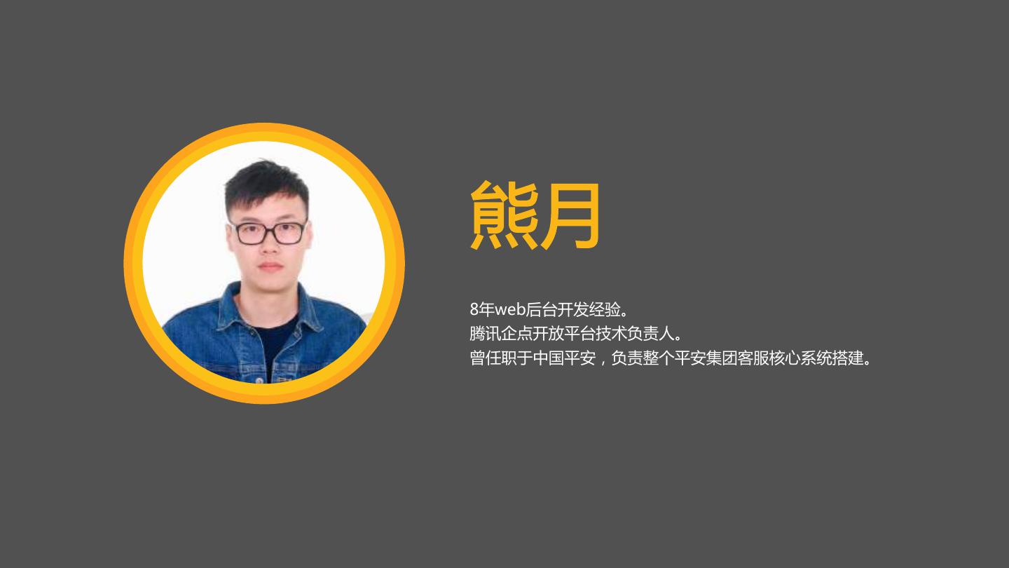 3 .熊月 8年web后台开发经验。 腾讯企点开放平台技术负责人。 曾任职于中国平安,负责整个平安集团客服核心系统搭建。
