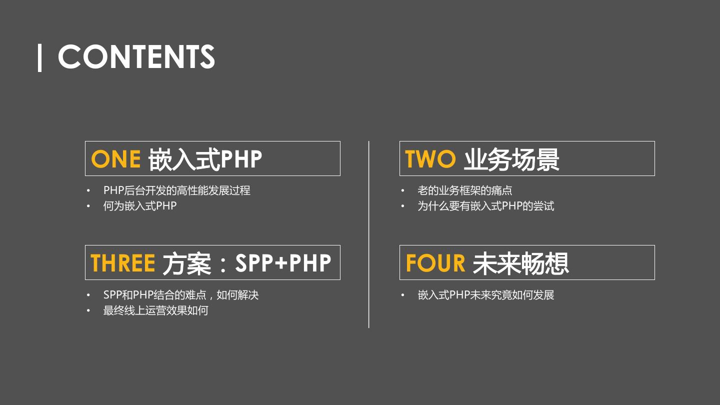 5 .CONTENTS ONE 嵌入式PHP TWO 业务场景 • PHP后台开发的高性能发展过程 • 老的业务框架的痛点 • 何为嵌入式PHP • 为什么要有嵌入式PHP的尝试 THREE 方案:SPP+PHP FOUR 未来畅想 • SPP和PHP结合的难点,如何解决 • 嵌入式PHP未来究竟如何发展 • 最终线上运营效果如何