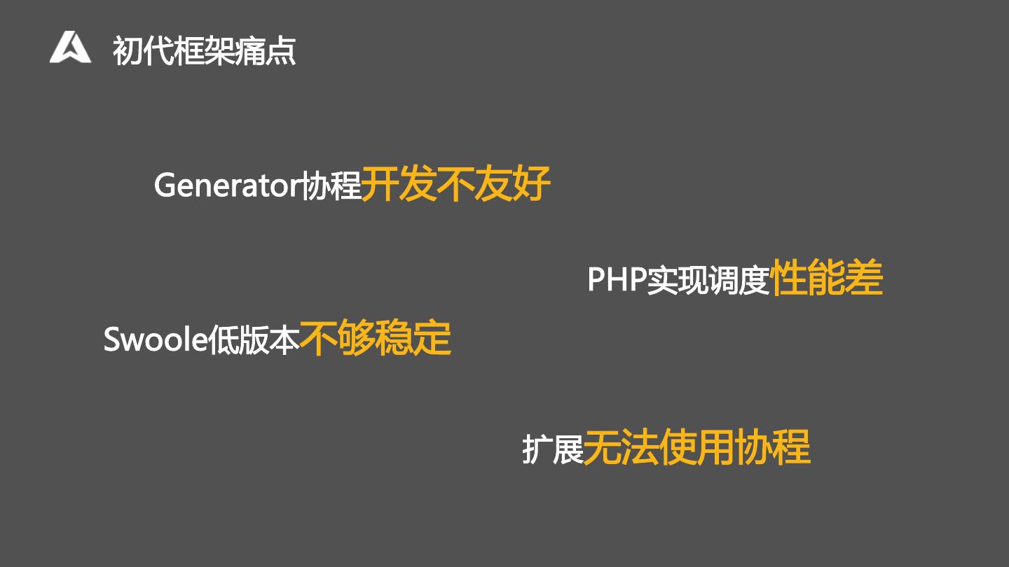 11 .初代框架痛点 Generator协程开发不友好 PHP实现调度性能差 Swoole低版本不够稳定 扩展无法使用协程