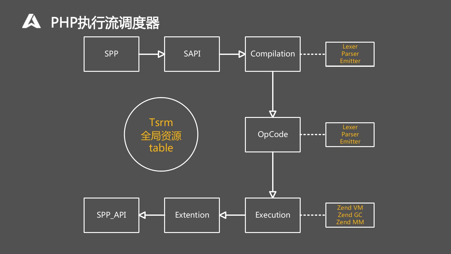 20 .PHP执行流调度器 Lexer SPP SAPI Compilation Parser Emitter Tsrm Lexer 全局资源 OpCode Parser Emitter table Zend VM SPP_API Extention Execution Zend GC Zend MM
