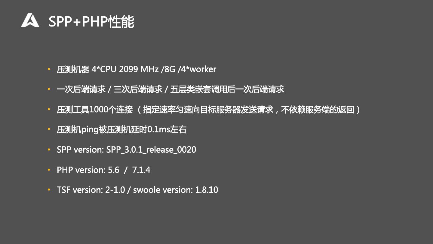 23 .SPP+PHP性能 • 压测机器 4*CPU 2099 MHz /8G /4*worker • 一次后端请求/三次后端请求/五层类嵌套调用后一次后端请求 • 压测工具1000个连接 (指定速率匀速向目标服务器发送请求,不依赖服务端的返回) • 压测机ping被压测机延时0.1ms左右 • SPP version: SPP_3.0.1_release_0020 • PHP version: 5.6 / 7.1.4 • TSF version: 2-1.0/swoole version: 1.8.10