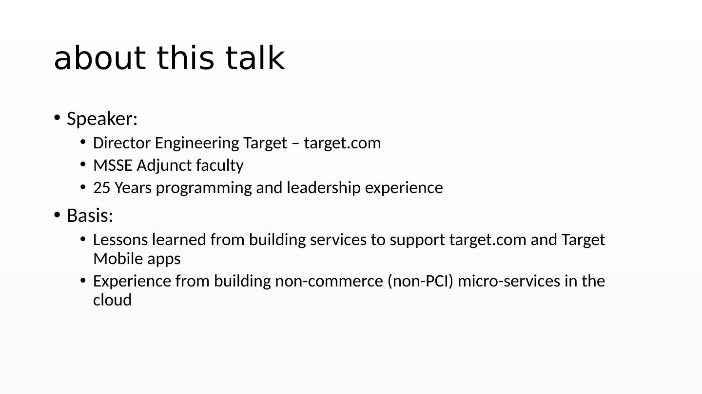 2 .a bout this talk Speaker: Director Engineering Target – target.com MSSE Adjunct faculty 25 Years programming and leadership experience Basis: Lessons learned from building services to support target.com and Target Mobile apps Experience from building non-commerce (non-PCI) micro-services in the cloud
