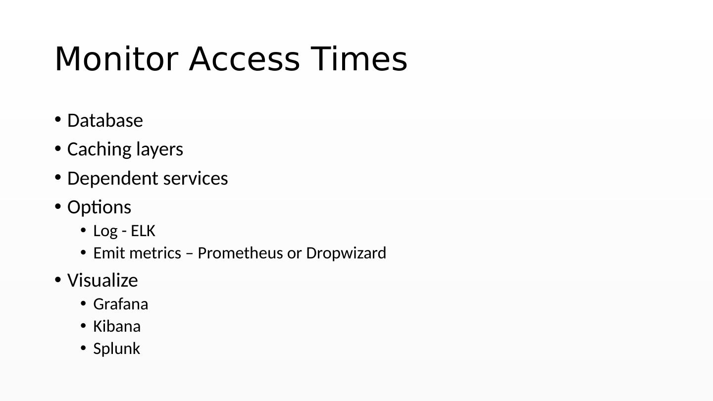 8 .Monitor Access Times Database Caching layers Dependent services Options Log - ELK Emit metrics – Prometheus or Dropwizard Visualize Grafana Kibana Splunk
