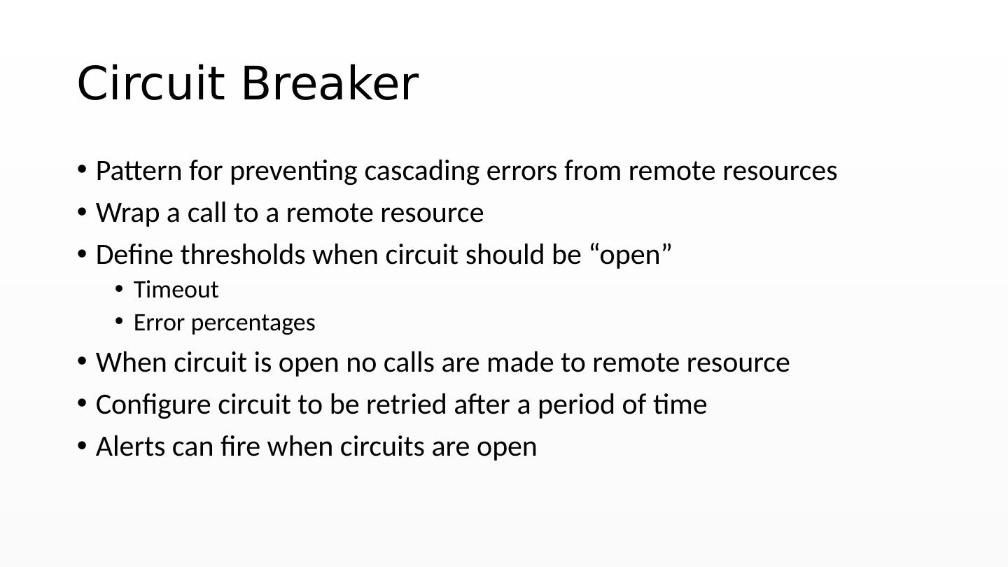 9 .Circuit Breaker Pattern for preventing cascading errors from remote resources Wrap a call to a remote resource Define thresholds when circuit should be “open” Timeout Error percentages When circuit is open no calls are made to remote resource Configure circuit to be retried after a period of time Alerts can fire when circuits are open