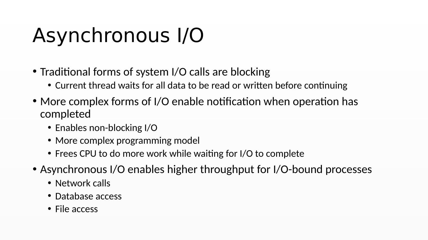 14 .Asynchronous I/O Traditional forms of system I/O calls are blocking C urrent thread waits for all data to be read or written before continuing More complex forms of I/O enable notification when operation has completed Enables non-blocking I/O More complex programming model Frees CPU to do more work while waiting for I/O to complete Asynchronous I/O enables higher throughput for I/O-bound processes Network calls Database access File access