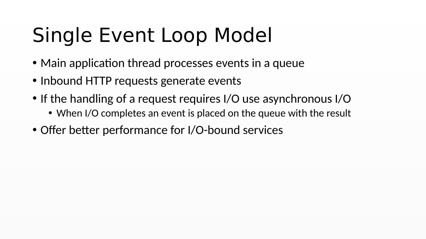 16 .Single Event Loop Model Main application thread processes events in a queue Inbound HTTP requests generate events If the handling of a request requires I/O use asynchronous I/O When I/O completes an event is placed on the queue with the result Offer better performance for I/O-bound services