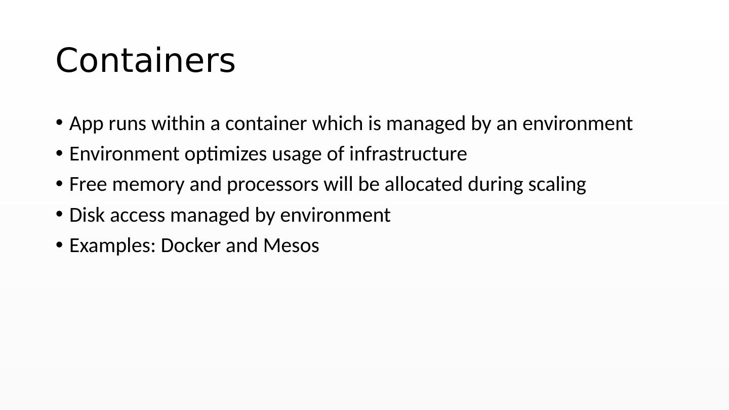 24 .Containers App runs within a container which is managed by an environment Environment optimizes usage of infrastructure Free memory and processors will be allocated during scaling Disk access managed by environment Examples: Docker and Mesos