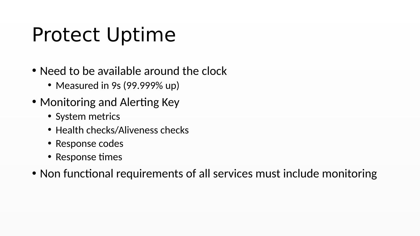 26 .Protect Uptime Need to be available around the clock Measured in 9s (99.999% up) Monitoring and Alerting Key System metrics Health checks/Aliveness checks Response codes Response times Non functional requirements of all services must include monitoring