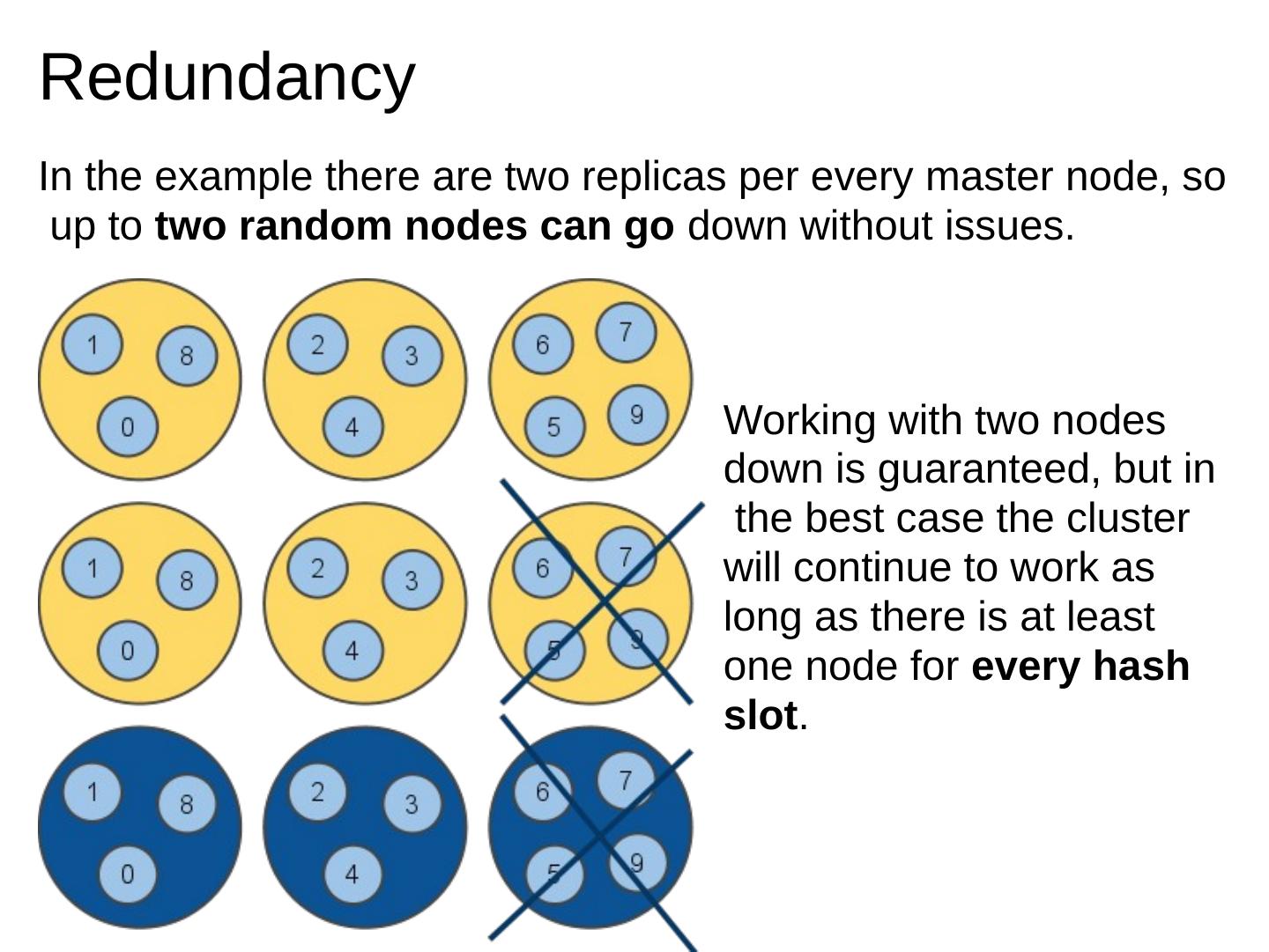 6 .Redundancy In the example there are two replicas per every master node, so up to two random nodes can go down without issues. Working with two nodes down is guaranteed, but in the best case the cluster will continue to work as long as there is at least one node for every hash slot .