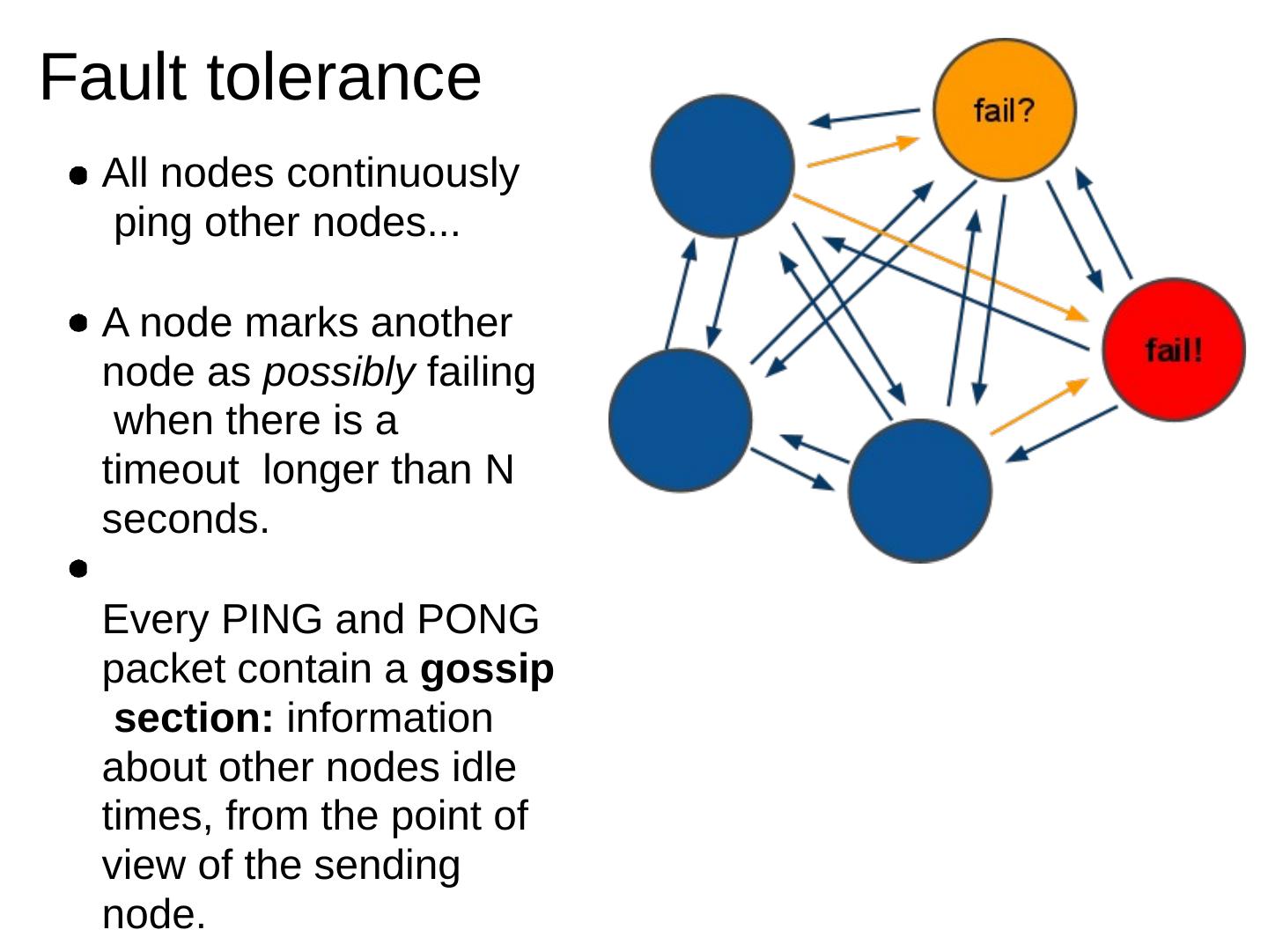 15 .Fault tolerance All nodes continuously ping other nodes... A node marks another node as possibly failing when there is a timeout longer than N seconds. Every PING and PONG packet contain a gossip section: information about other nodes idle times, from the point of view of the sending node.