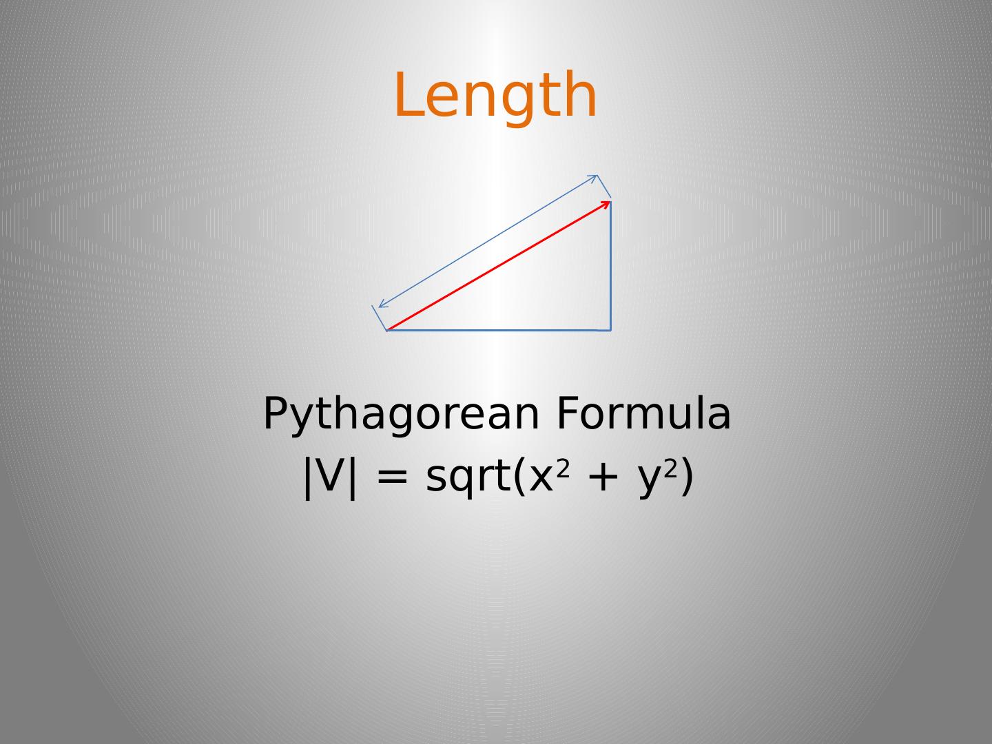 5 .Length Pythagorean Formula | V | = sqrt (x 2 + y 2 )