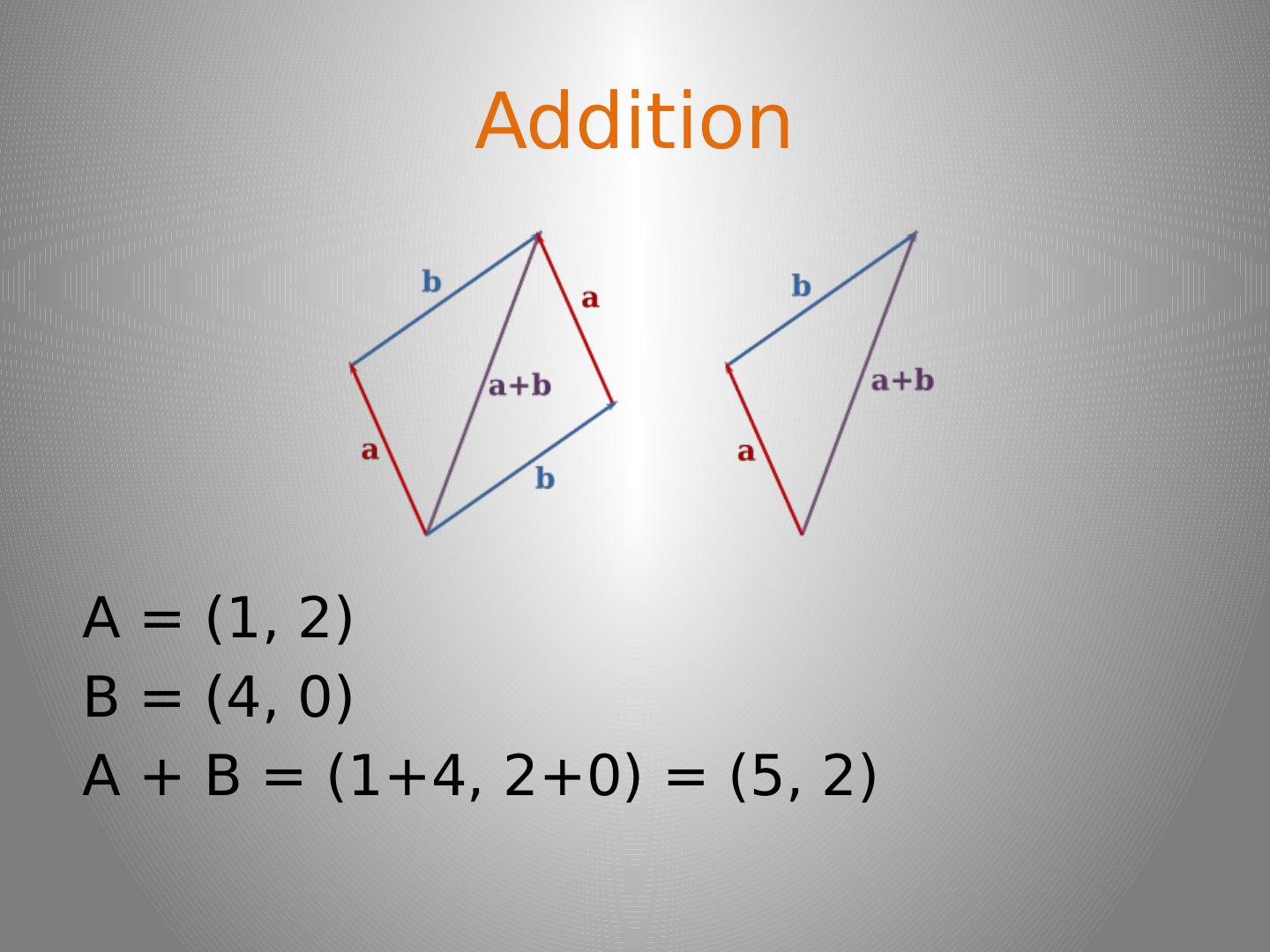 6 .Addition A = (1, 2) B = (4, 0) A + B = (1+4, 2+0) = (5, 2)