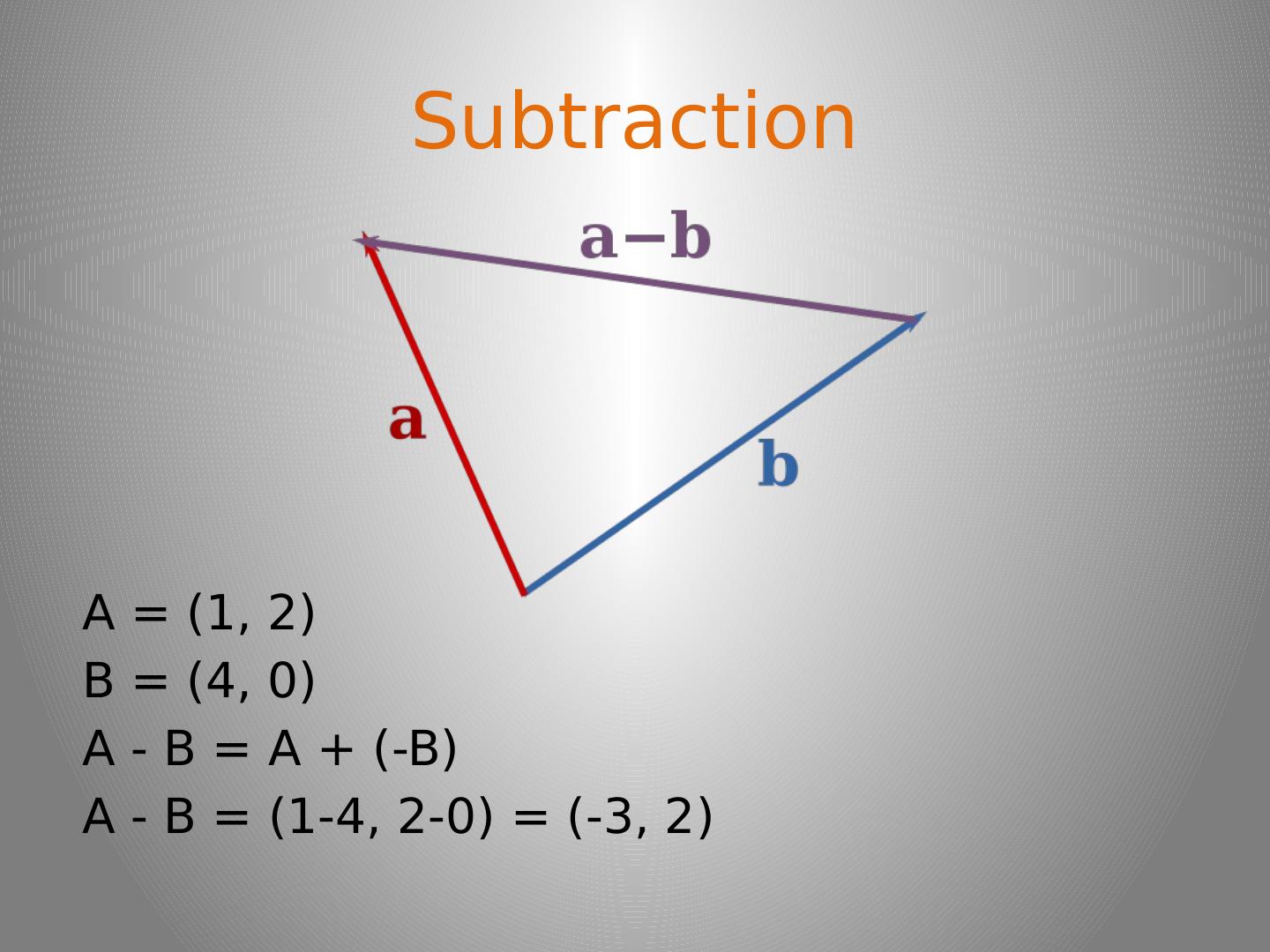 8 .Subtraction A = (1, 2) B = (4, 0) A - B = A + (-B ) A - B = ( 1-4 , 2-0) = (-3, 2)