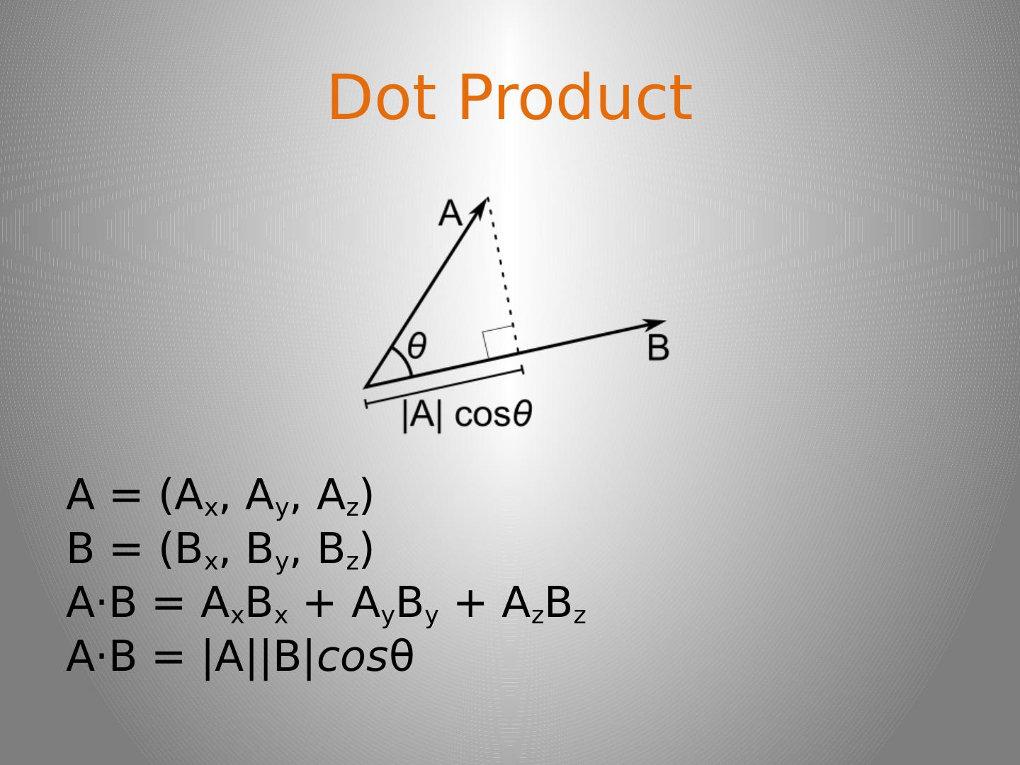 9 .Dot Product A = (A x , A y , A z ) B = ( B x , B y , B z ) A · B = A x B x + A y B y + A z B z A · B = |A|| B| cos θ