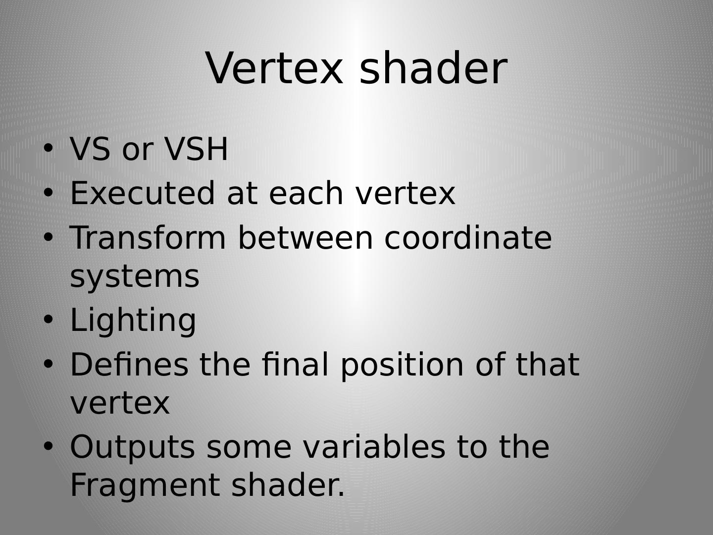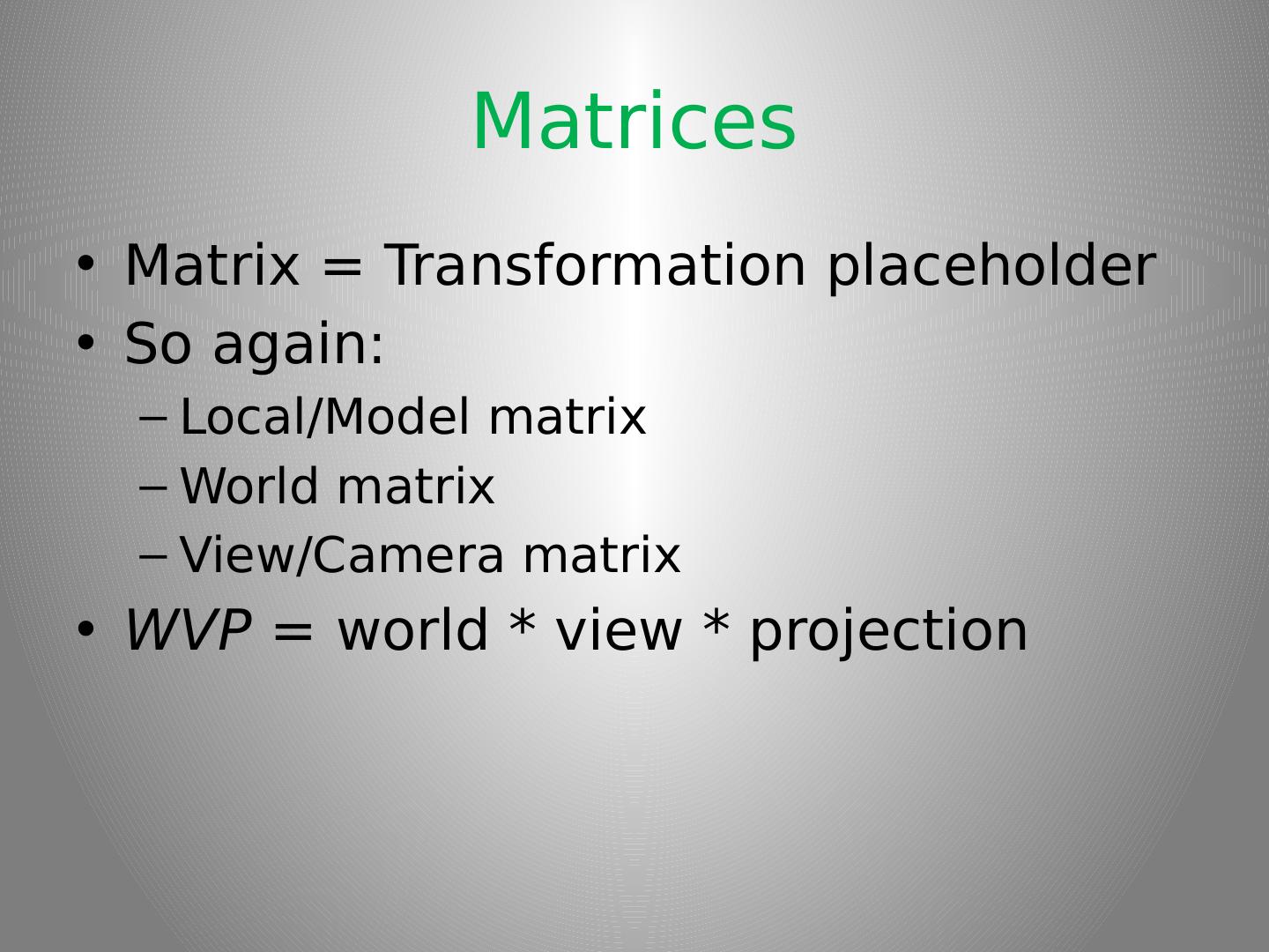 17 .Matrices Matrix = Transformation placeholder So again: Local/Model matrix World matrix View/Camera matrix WVP = world * view * projection