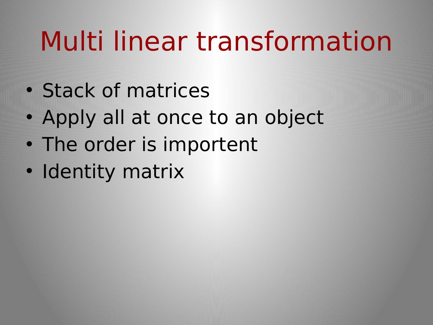 24 .Multi linear transformation Stack of matrices Apply all at once to an object The order is importent Identity matrix