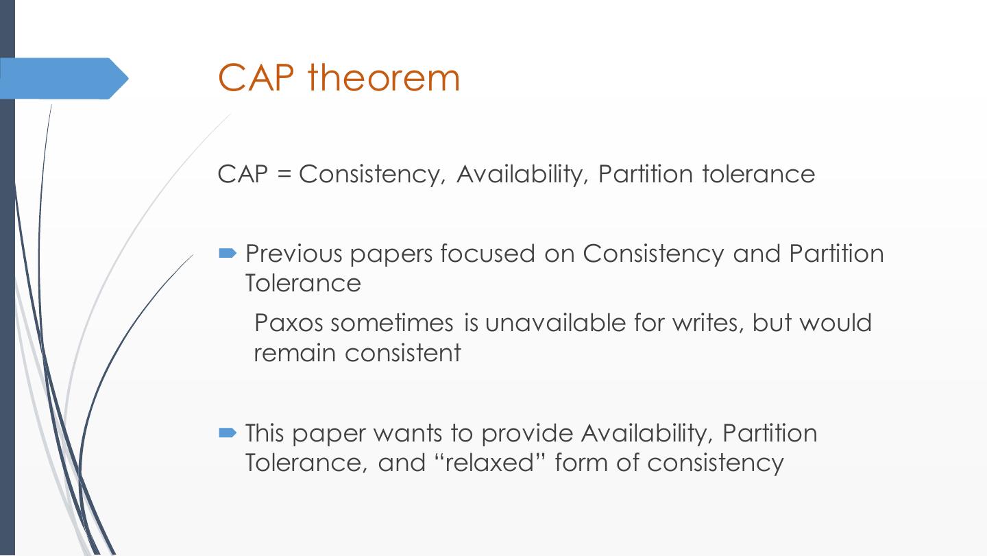 5 .CAP theorem CAP = Consistency, Availability, Partition tolerance Previous papers focused on Consistency and Partition Tolerance Paxos sometimes is unavailable for writes, but would remain consistent This paper wants to provide Availability, Partition Tolerance, and “relaxed” form of consistency