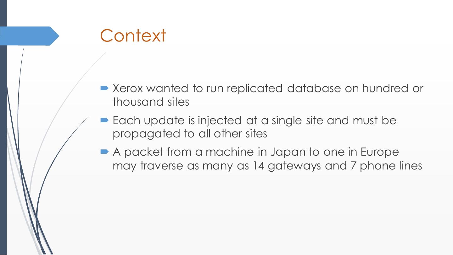 9 .Context Xerox wanted to run replicated database on hundred or thousand sites Each update is injected at a single site and must be propagated to all other sites A packet from a machine in Japan to one in Europe may traverse as many as 14 gateways and 7 phone lines