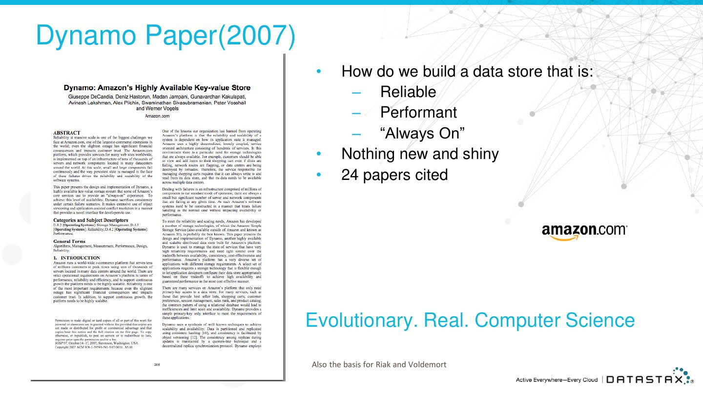 9 . Dynamo Paper(2007) • How do we build a data store that is: – Reliable – Performant – “Always On” • Nothing new and shiny • 24 papers cited Evolutionary. Real. Computer Science Also the basis for Riak and Voldemort 9