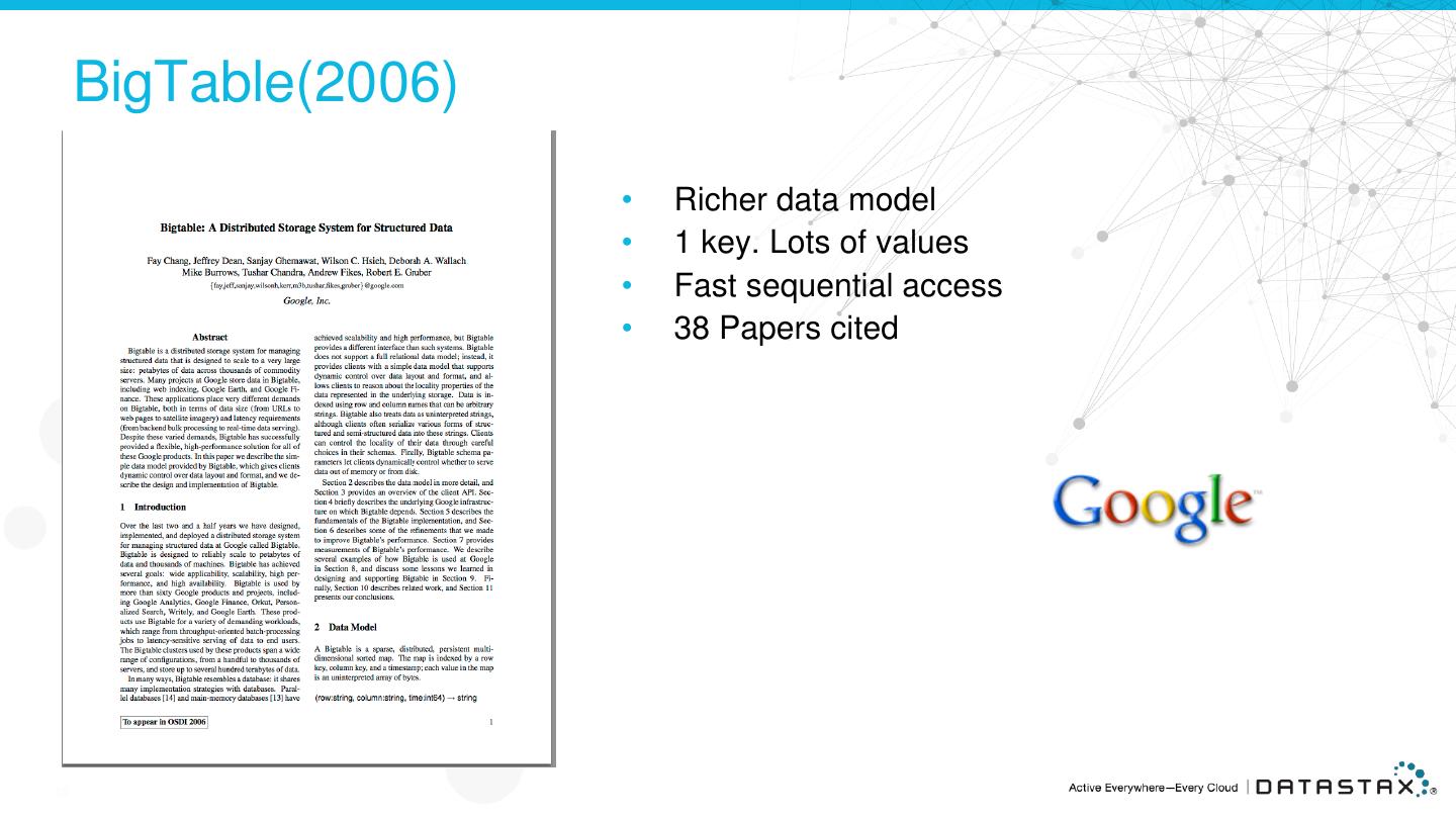 10 . BigTable(2006) • Richer data model • 1 key. Lots of values • Fast sequential access • 38 Papers cited 10