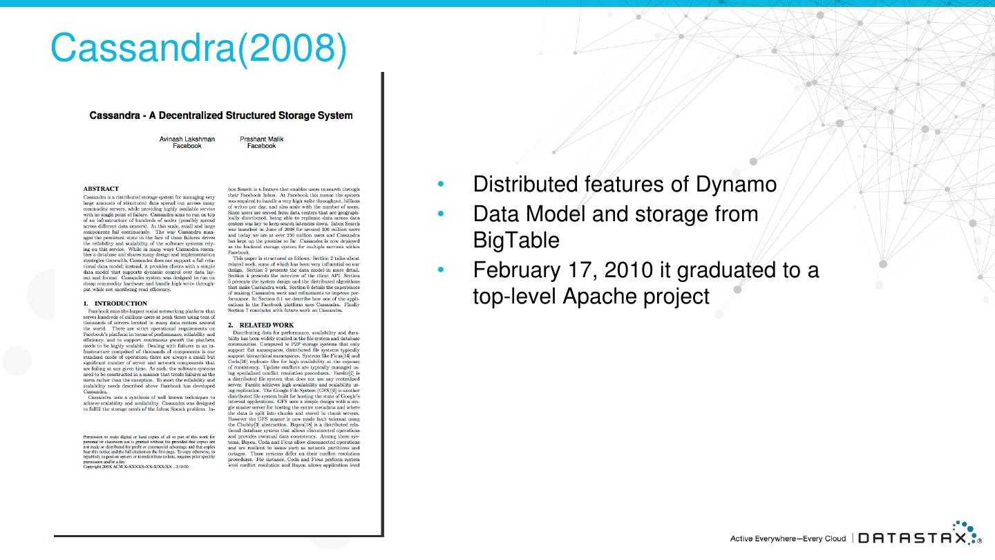 11 . Cassandra(2008) • Distributed features of Dynamo • Data Model and storage from BigTable • February 17, 2010 it graduated to a top-level Apache project 11