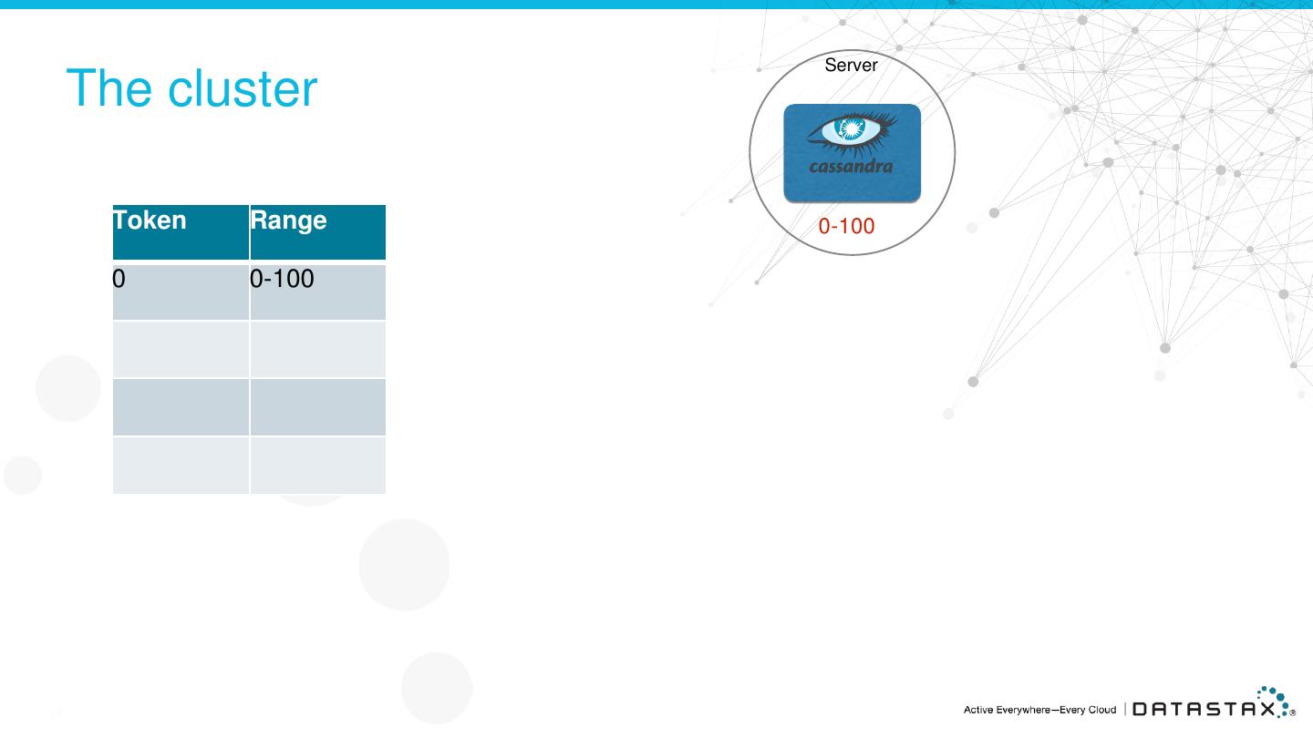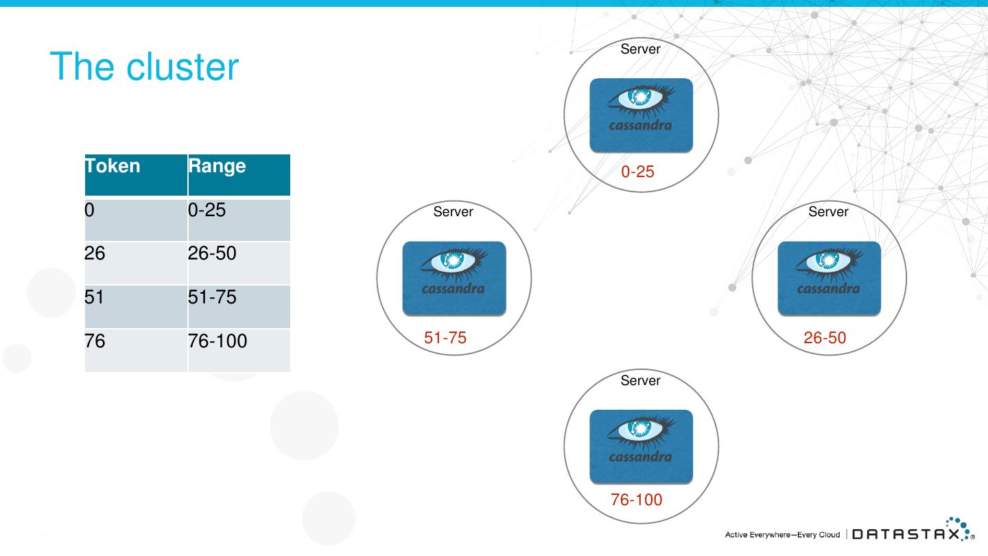 17 . Server The cluster Token Range 0-25 0 0-25 Server Server 26 26-50 51 51-75 76 76-100 51-75 26-50 Server 76-100 17