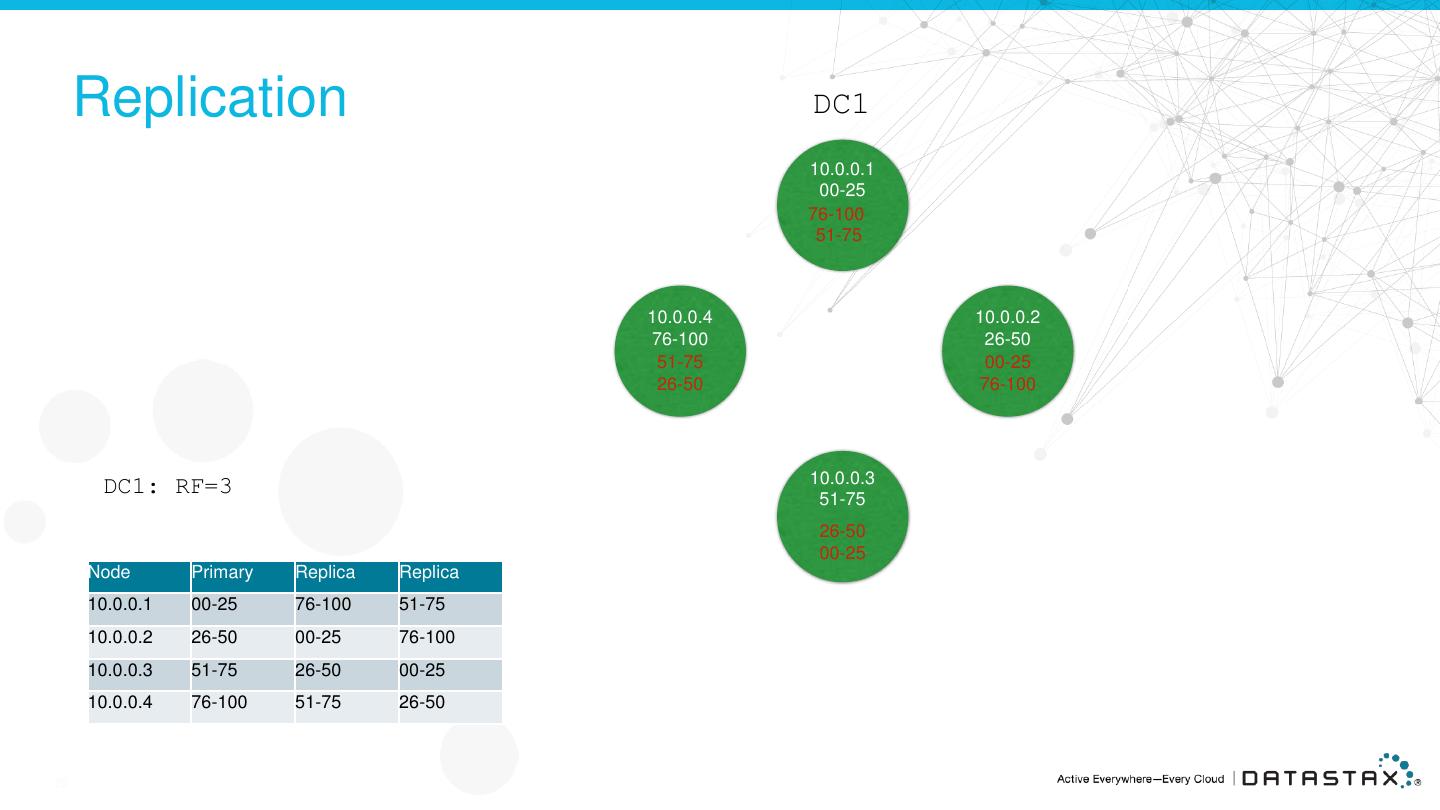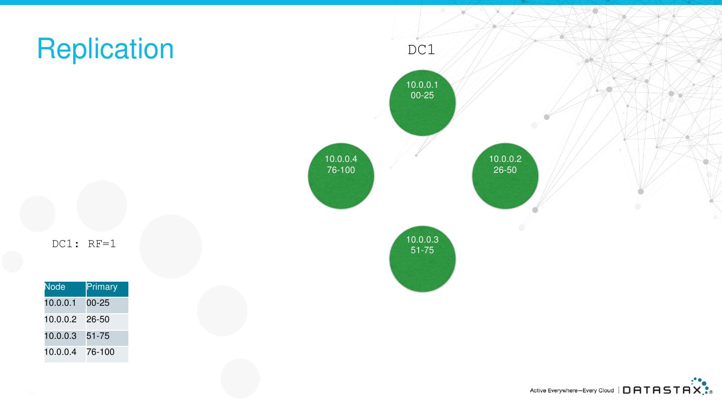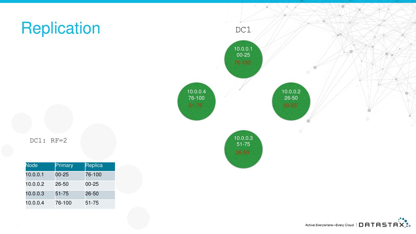19 . Replication DC1 10.0.0.1 00-25 76-100 10.0.0.4 10.0.0.2 76-100 26-50 51-75 00-25 10.0.0.3 DC1: RF=2 51-75 26-50 Node Primary Replica 10.0.0.1 00-25 76-100 10.0.0.2 26-50 00-25 10.0.0.3 51-75 26-50 10.0.0.4 76-100 51-75 19