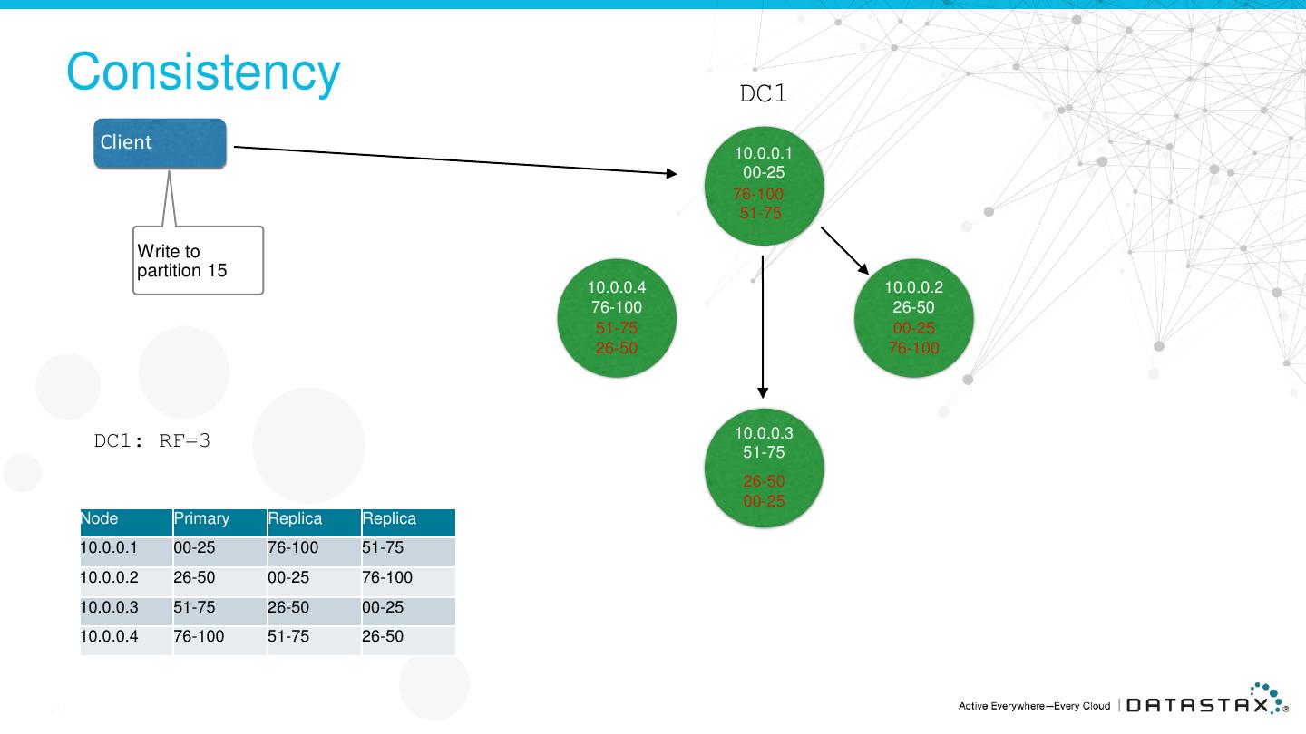 21 . Consistency DC1 Client 10.0.0.1 00-25 76-100 51-75 Write to partition 15 10.0.0.4 10.0.0.2 76-100 26-50 51-75 00-25 26-50 76-100 10.0.0.3 DC1: RF=3 51-75 26-50 00-25 Node Primary Replica Replica 10.0.0.1 00-25 76-100 51-75 10.0.0.2 26-50 00-25 76-100 10.0.0.3 51-75 26-50 00-25 10.0.0.4 76-100 51-75 26-50 21