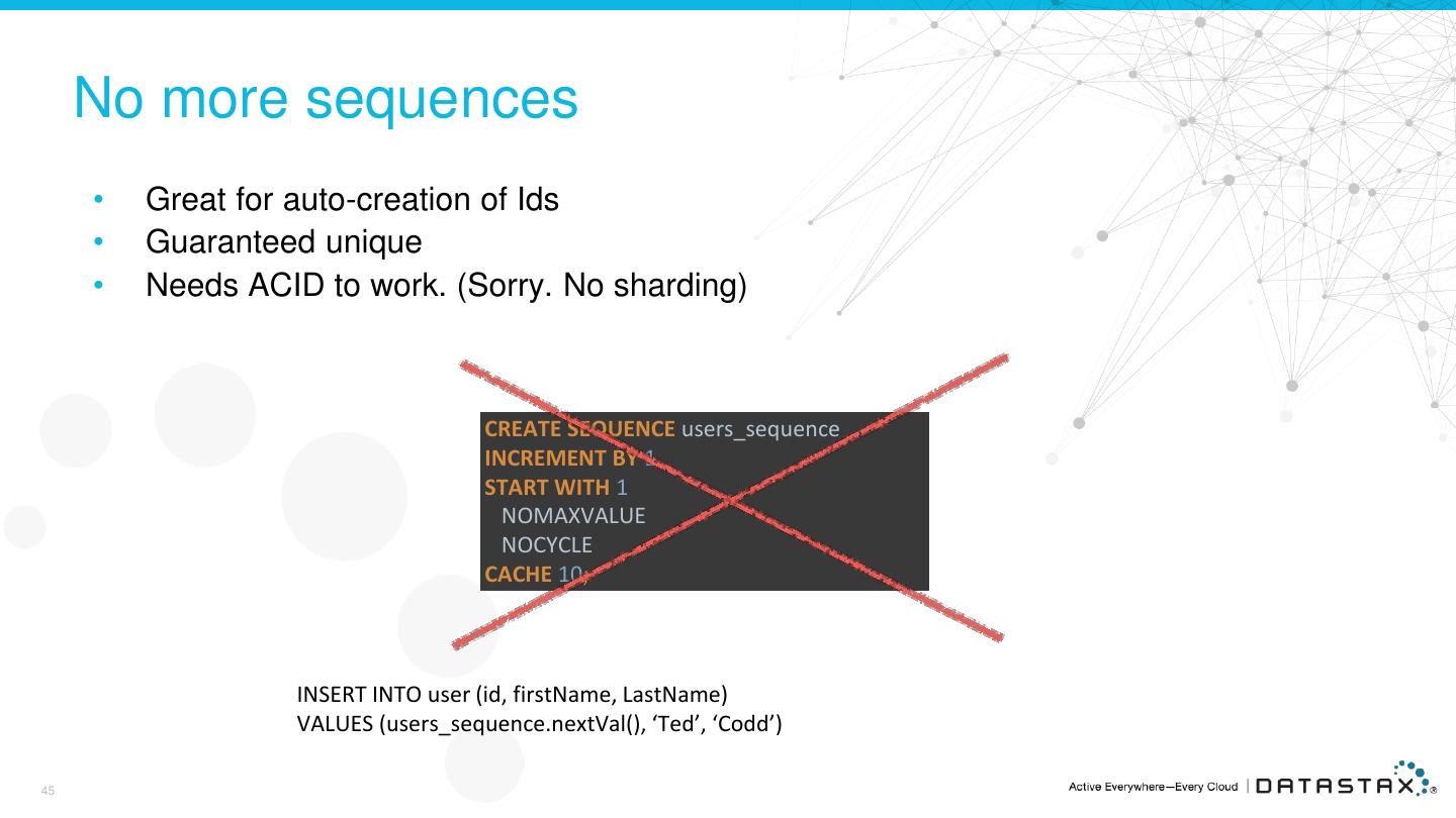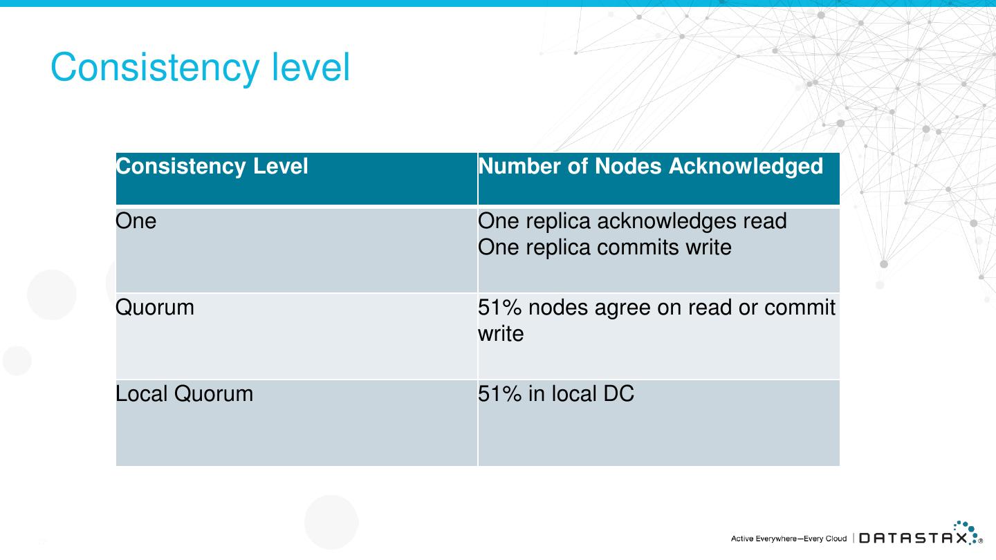 22 . Consistency level Consistency Level Number of Nodes Acknowledged One One replica acknowledges read One replica commits write Quorum 51% nodes agree on read or commit write Local Quorum 51% in local DC 22