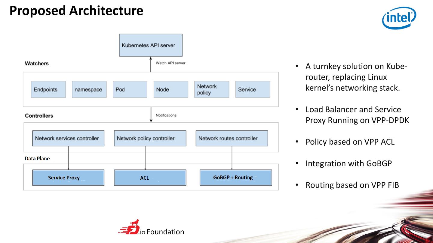 6 .Proposed Architecture • A turnkey solution on Kube- router, replacing Linux kernel’s networking stack. • Load Balancer and Service Proxy Running on VPP-DPDK • Policy based on VPP ACL • Integration with GoBGP • Routing based on VPP FIB Foundation